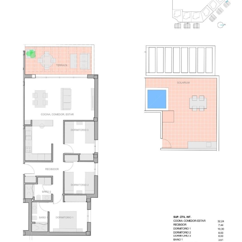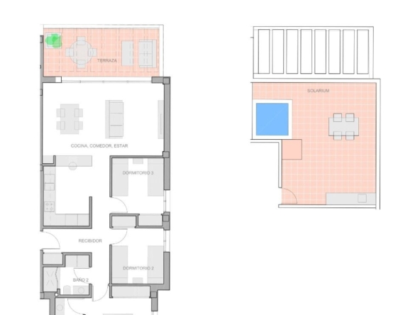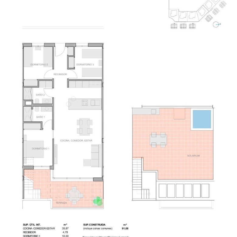 Estos apartamentos disponen de 3 dormitorios, 2 baños, salón diáfano con cocina, planta baja con jardín privado, planta media con terraza y planta alta con solarium privado.