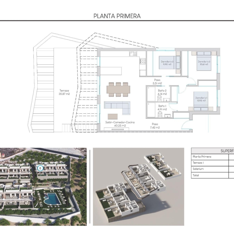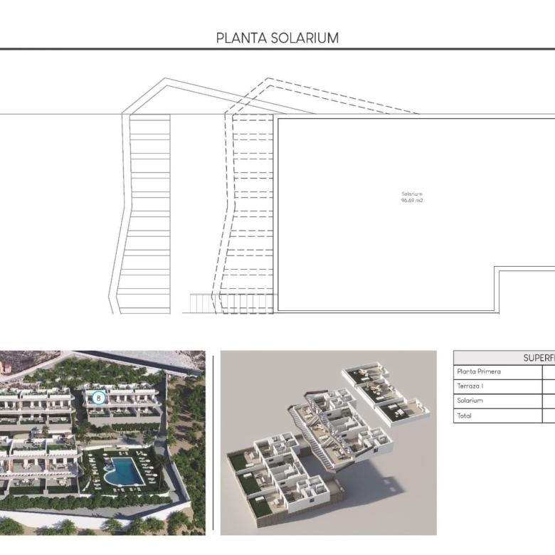 Bungalows en planta alta con solarium privado y bungalows en planta baja con jardín privado y posibilidad de piscina privada con coste adicional.