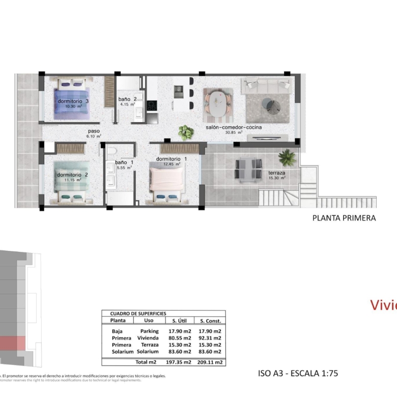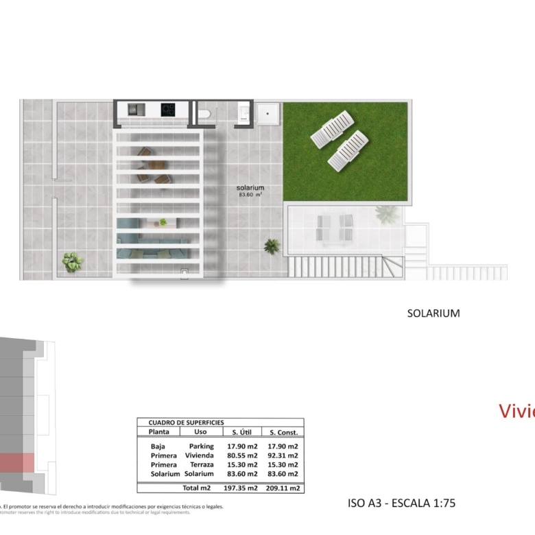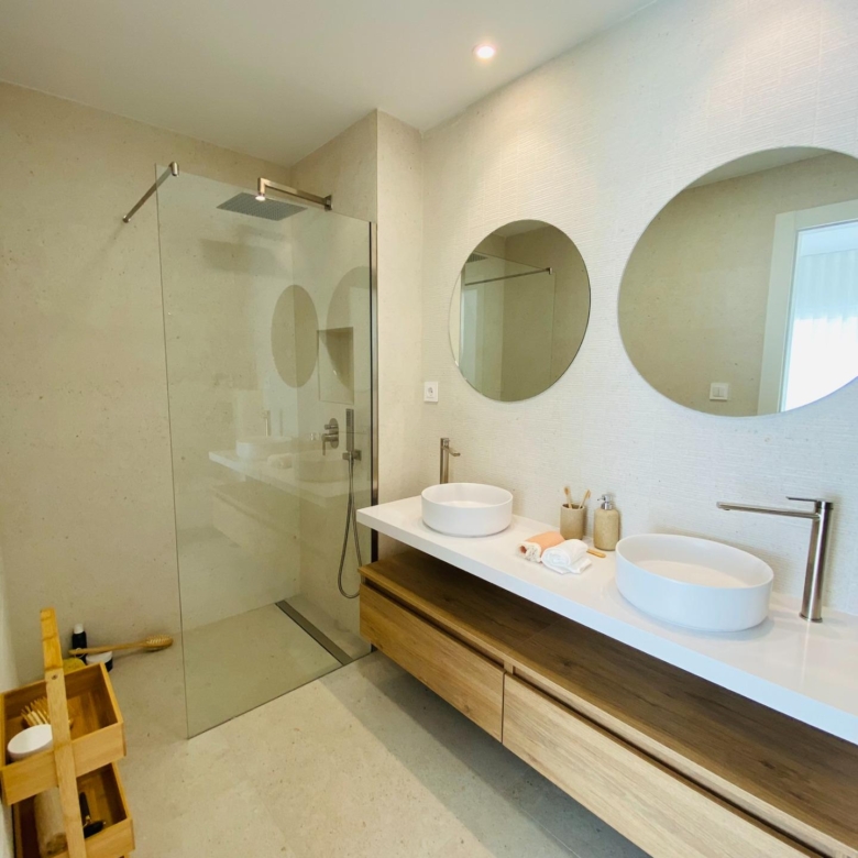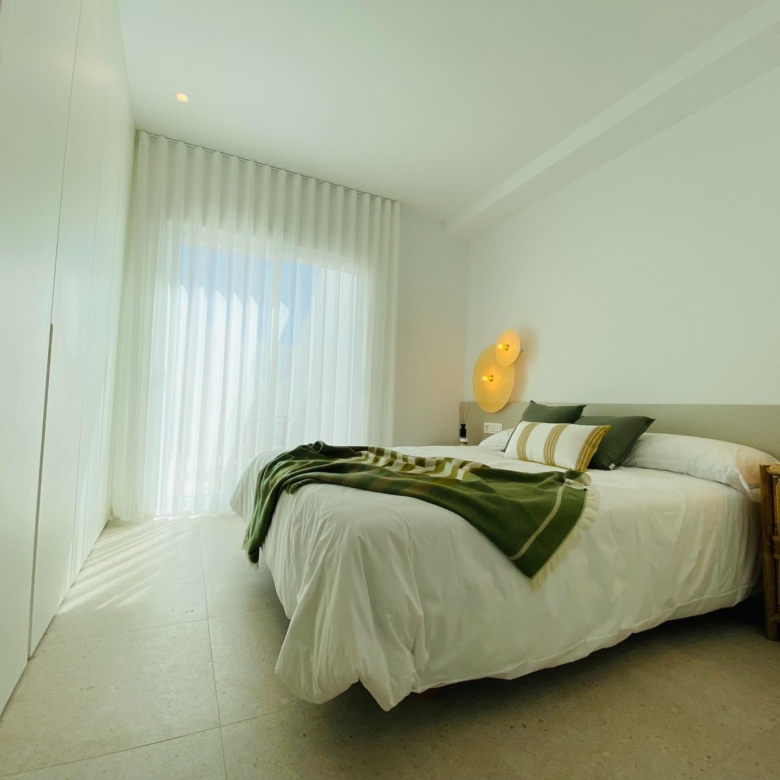 Cada bungalow incluye un salón-comedor luminoso y abierto y una cocina totalmente equipada con grandes puertas correderas que conectan a la perfección los espacios interiores y exteriores. Los dormitorios cuentan con armarios empotrados. El complejo dispone de aire acondicionado por conductos y ascensor para facilitar el acceso a las plantas superiores. También se incluyen plazas de aparcamiento privado para todas las unidades.