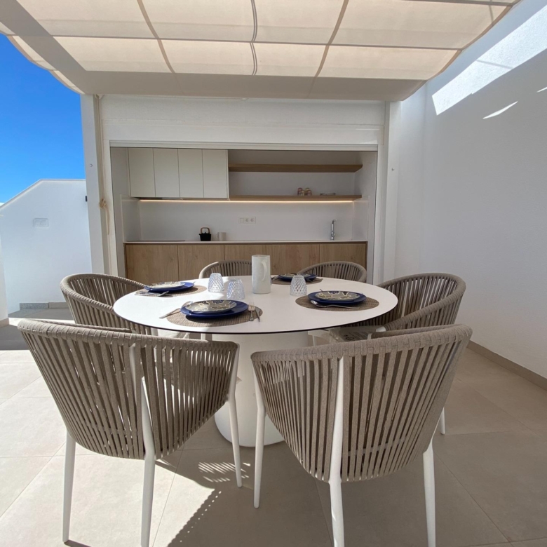 Esta nueva promoción ofrece 16 elegantes bungalows en la deseable localidad de Pilar de la Horadada, situada en la parte más meridional de la Costa Blanca. Elija entre 2 o 3 dormitorios, cada uno con 2 baños. Los bungalows de la planta baja disponen de amplias terrazas delanteras y traseras con acceso directo a la piscina y el jardín comunitarios, mientras que los de la planta superior cuentan con un gran solárium privado en la azotea.