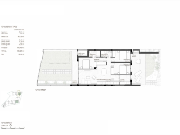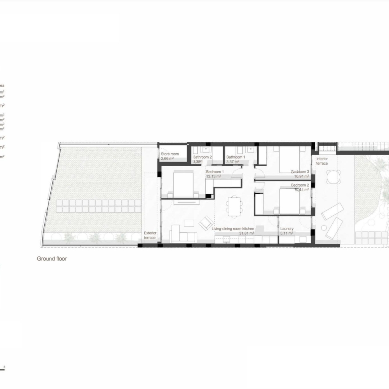 Los 18 bungalows de la planta baja cuentan con una terraza interior y un jardín que dan a los jardines comunitarios y a la zona de la piscina, así como una gran terraza trasera cerrada y un jardín.