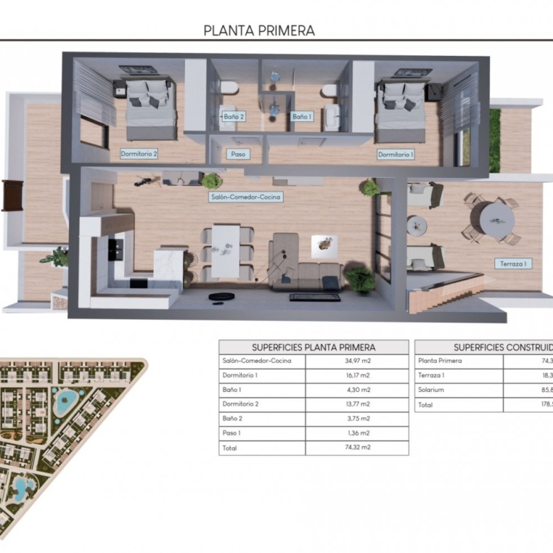 Las viviendas tienen más de 131m2 distribuidos en un amplio salón-comedor con cocina americana, 2 amplios dormitorios y 2 baños completos.