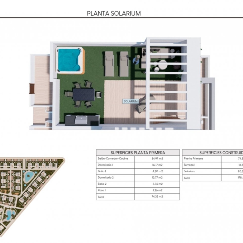 O bungalows en primera planta de 178m2 con su solarium de 85m2 con vistas panorámicas a la Laguna Rosa y al Mar Mediterráneo