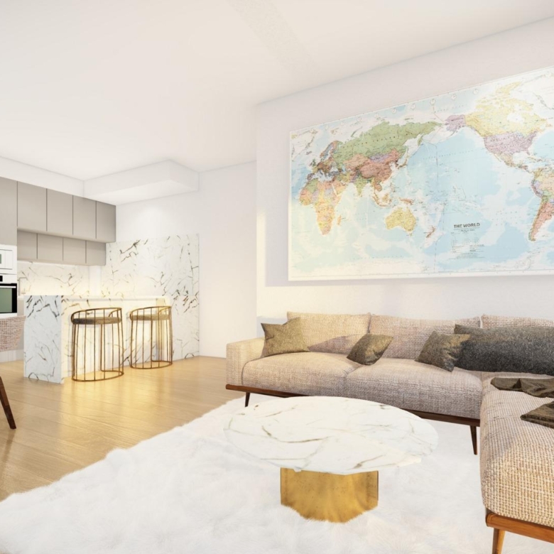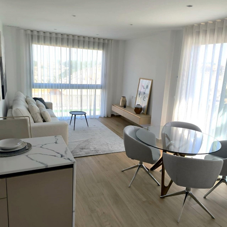 Las propiedades modernas consisten en 2 dormitorios, 2 cuartos de baño, cocina abierta del plan, la sala de estar con visiónes abiertas a la terraza, semi/sótano, solarium, jardín privado con el estacionamiento.