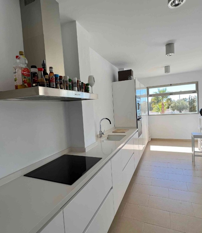 La primera planta consta de un amplio salón/comedor con chimenea de leña y con ventanas de suelo a techo que dan acceso a la terraza cubierta y a la piscina.