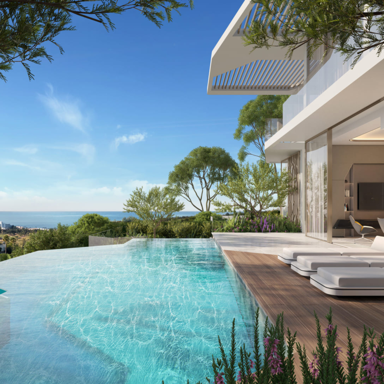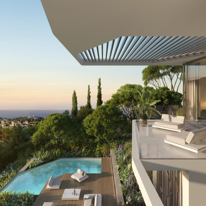 El diseño exterior de estas villas en Benahavís es simplemente espectacular. Cada propiedad cuenta con un jardín privado, perfecto para disfrutar del clima mediterráneo. Las terrazas amplias ofrecen un espacio ideal para el entretenimiento al aire libre, mientras que el solárium proporciona un lugar perfecto para relajarse y disfrutar de las vistas panorámicas al mar. Además, cada villa incluye una piscina privada, lo que garantiza un oasis personal de tranquilidad y lujo. La presencia de pérgolas añade un toque de elegancia y funcionalidad, permitiendo disfrutar de las áreas exteriores durante todo el año.
