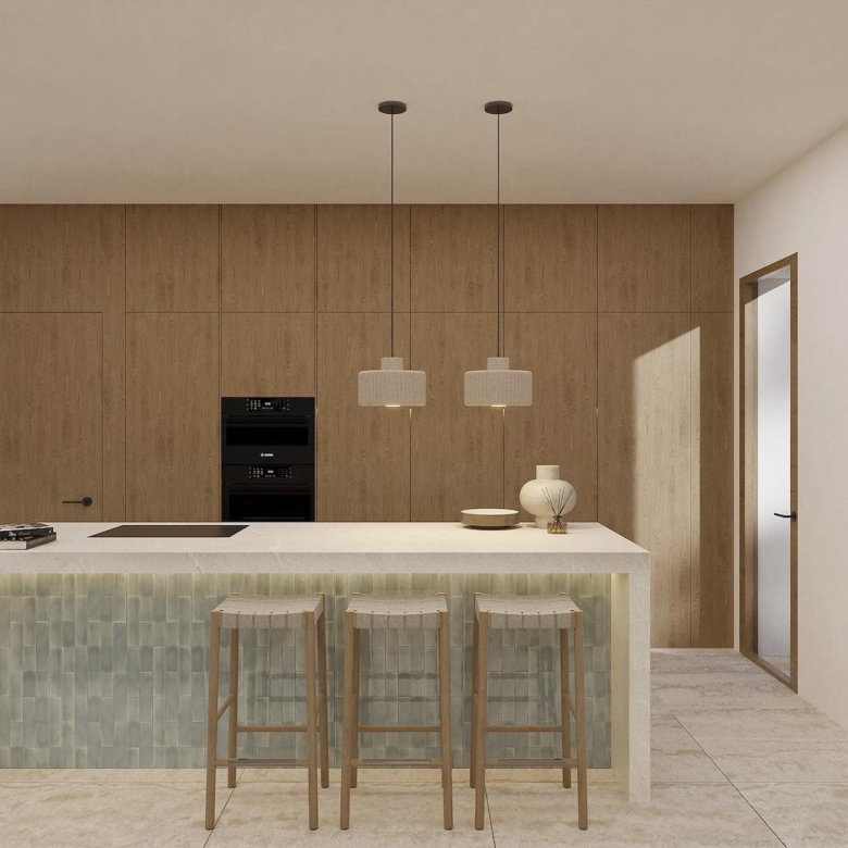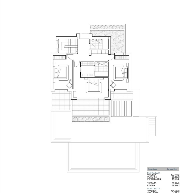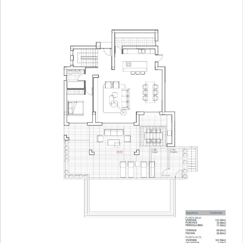 Situada en una parcela de más de 1.000 m², la propiedad se distribuye en dos niveles y ofrece un total de 4 amplios dormitorios y 3 baños. La planta baja presenta una distribución diáfana con un gran salón, comedor y cocina totalmente equipada con isla y barra americana. Las puertas correderas de suelo a techo conectan el interior con una generosa terraza orientada al sur, creando una perfecta fluidez entre el interior y el exterior. En este nivel también hay un dormitorio y un baño.