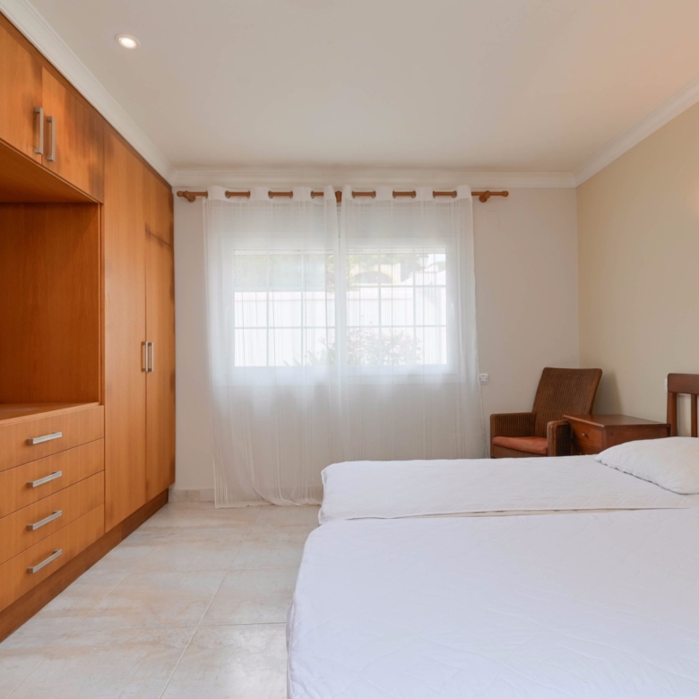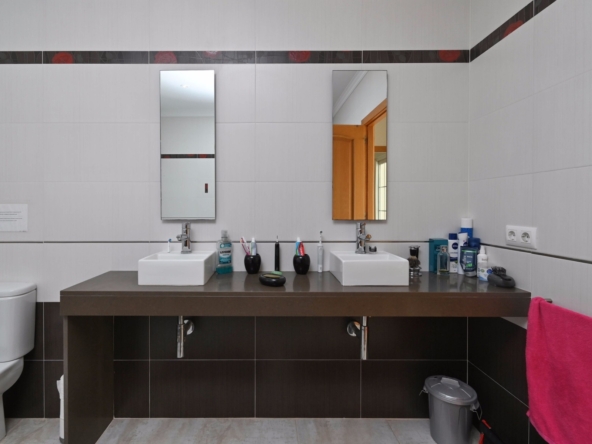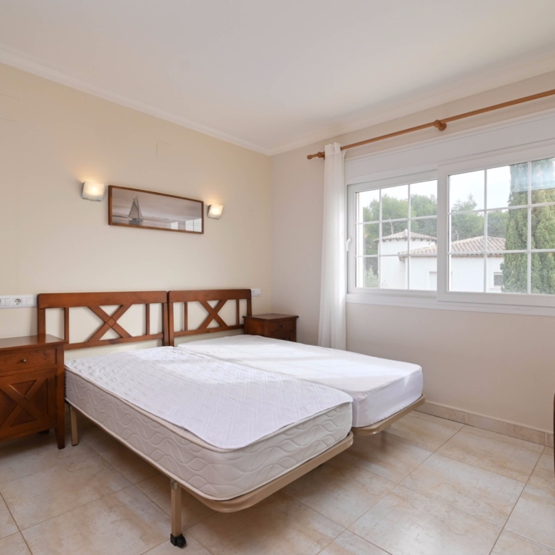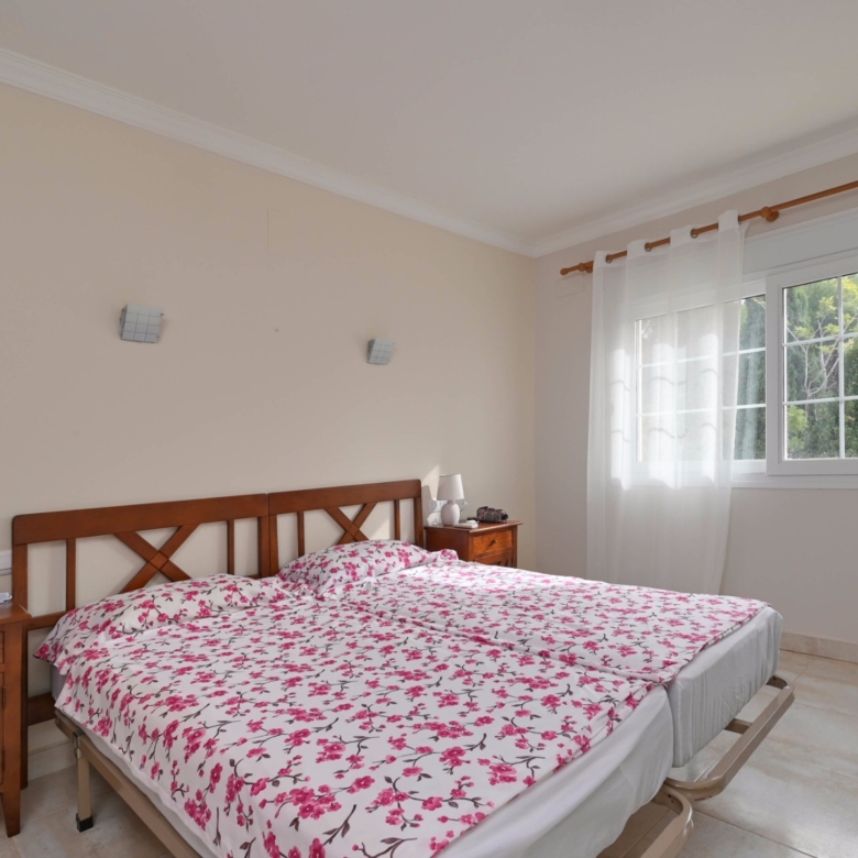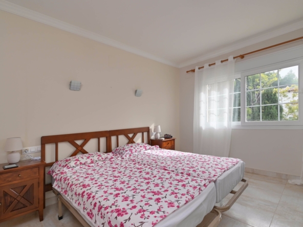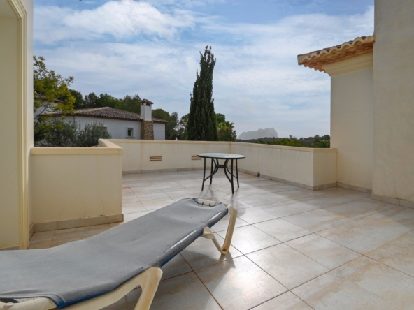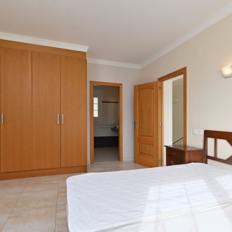 En la planta baja también hay dos amplios dormitorios con un baño compartido, ideal para familiares o invitados. En la planta superior, encontrará dos dormitorios adicionales, cada uno con su baño en suite. El primer dormitorio cuenta con un vestidor y un baño en suite con bañera y ducha. El segundo dormitorio tiene armarios empotrados, un baño en suite con bañera, y acceso directo a una amplia terraza. Desde esta terraza, se puede disfrutar de unas impresionantes vistas al mar y al icónico Peñón de Ifach, un monumento natural emblemático de la Costa Blanca.