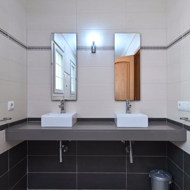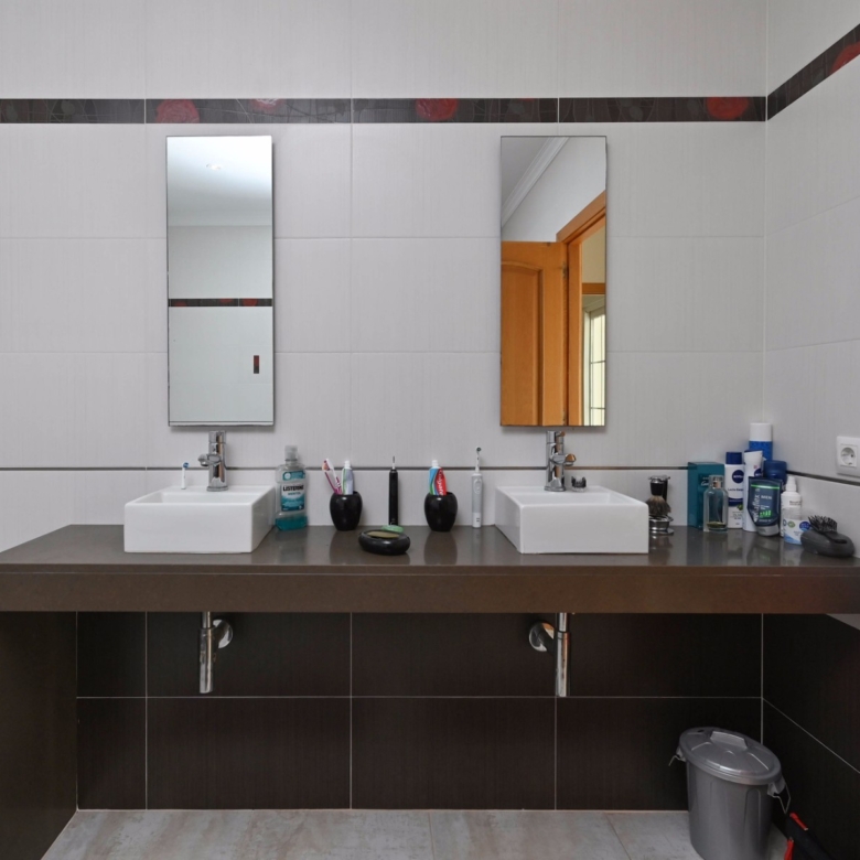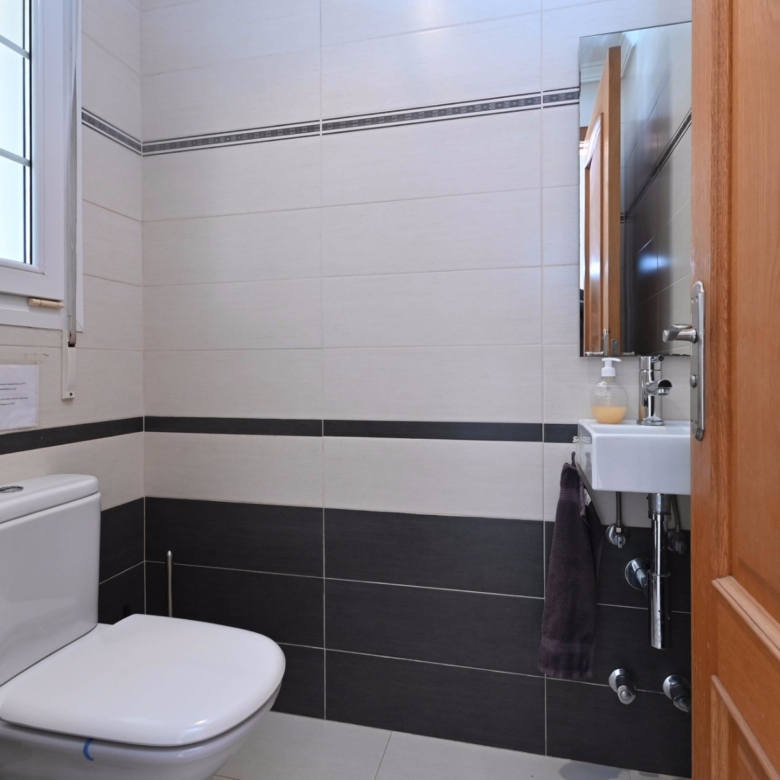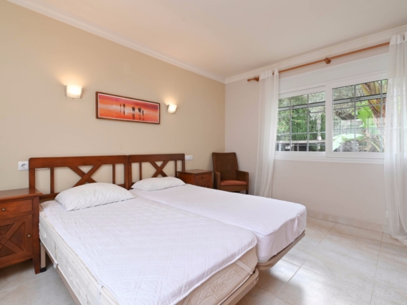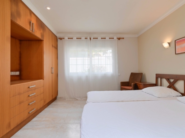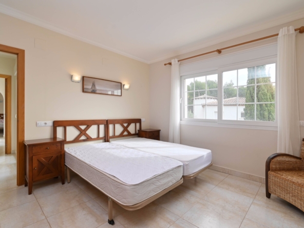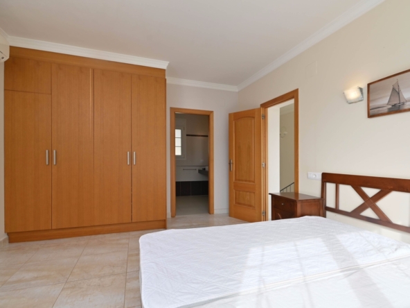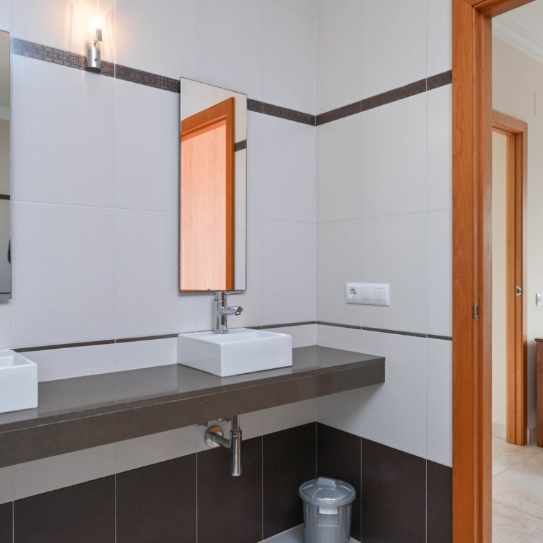 En la planta baja también hay dos amplios dormitorios con un baño compartido, ideal para familiares o invitados. En la planta superior, encontrará dos dormitorios adicionales, cada uno con su baño en suite. El primer dormitorio cuenta con un vestidor y un baño en suite con bañera y ducha. El segundo dormitorio tiene armarios empotrados, un baño en suite con bañera, y acceso directo a una amplia terraza. Desde esta terraza, se puede disfrutar de unas impresionantes vistas al mar y al icónico Peñón de Ifach, un monumento natural emblemático de la Costa Blanca.