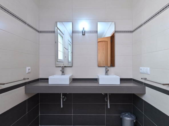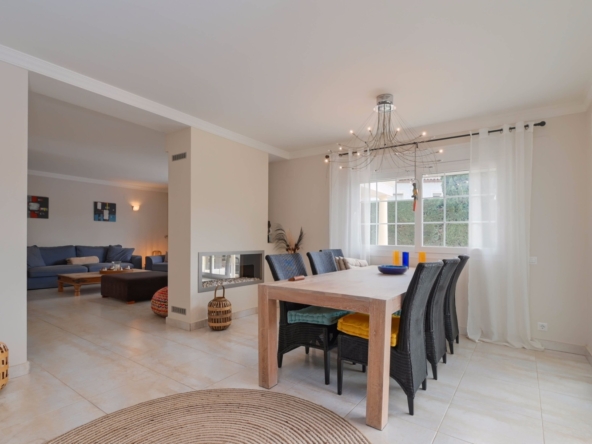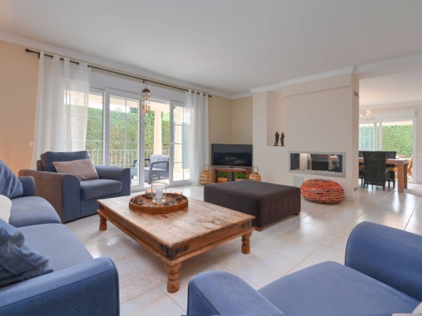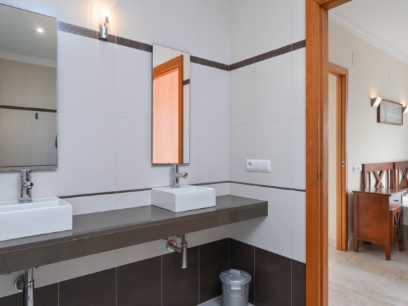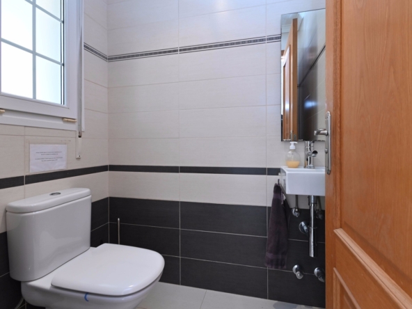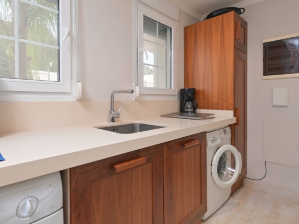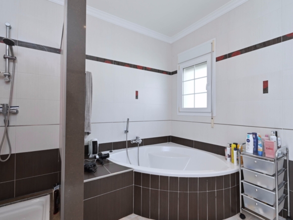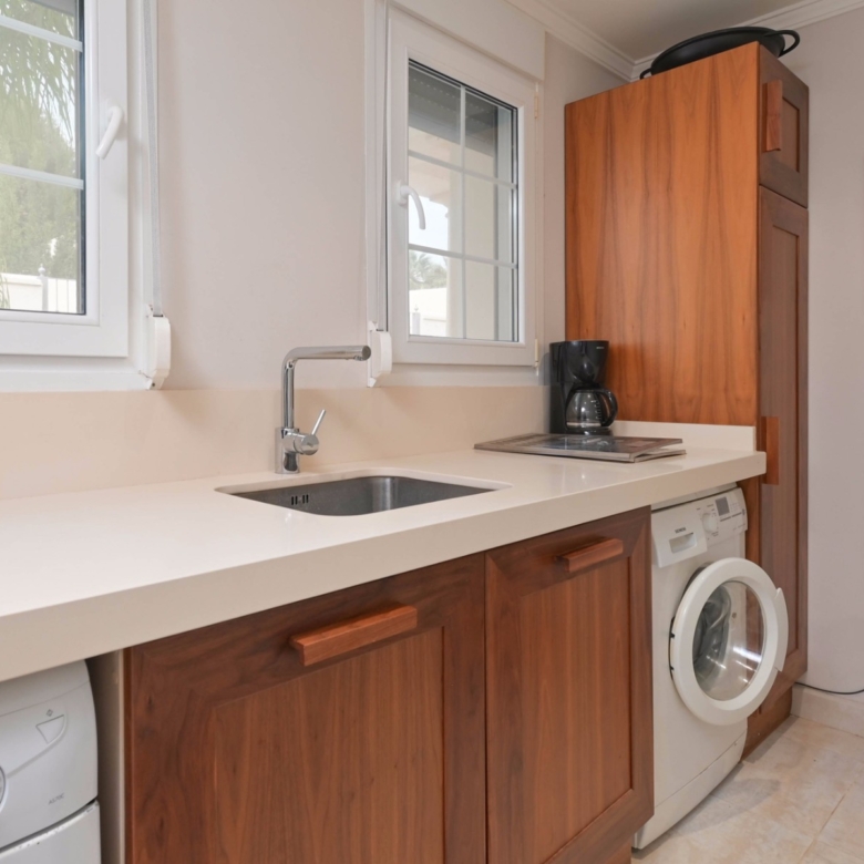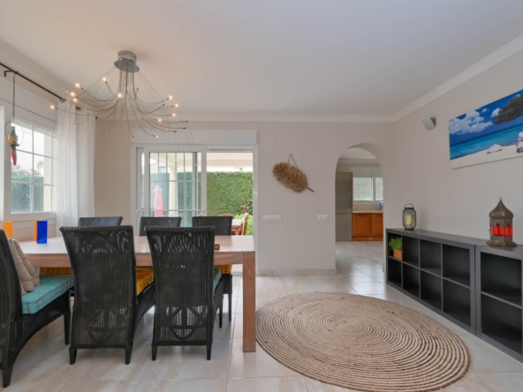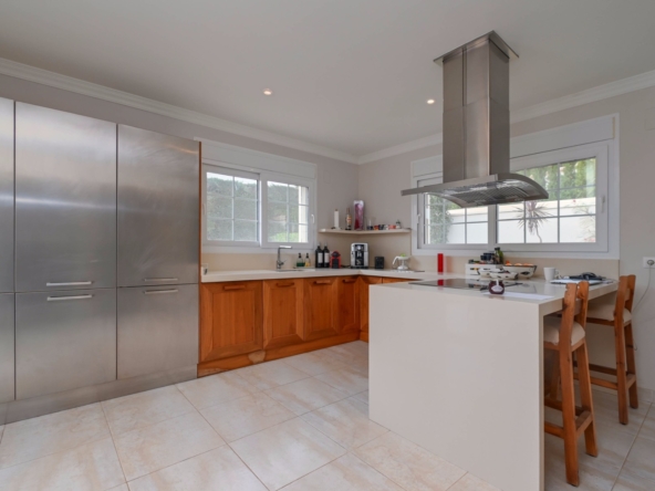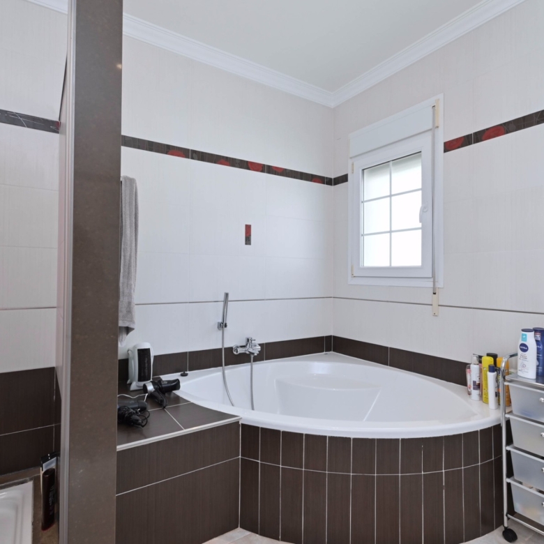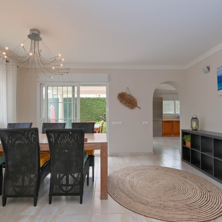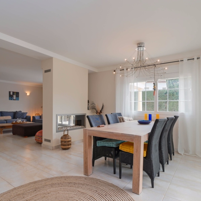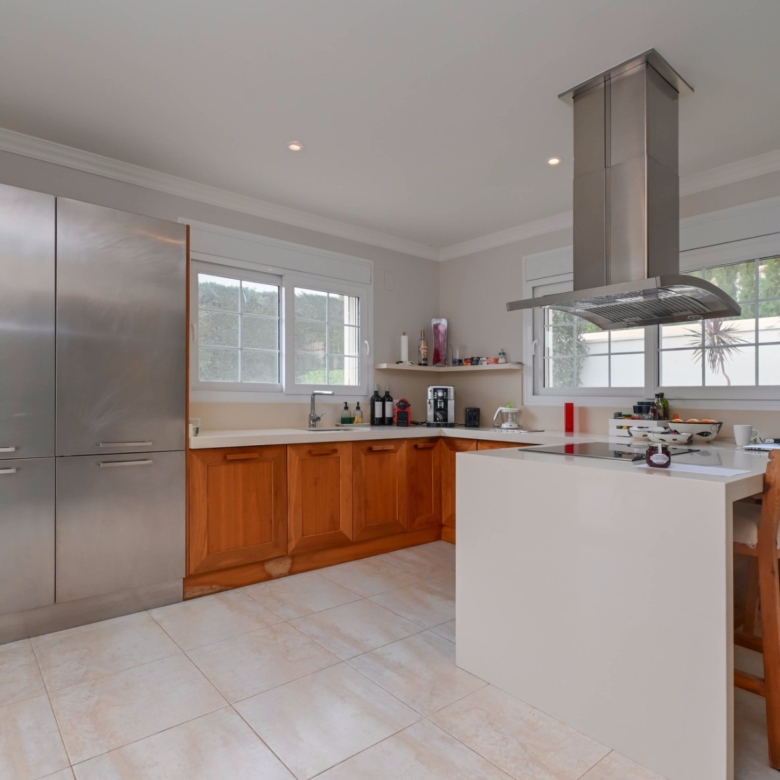 Con una generosa superficie habitable de 280 m², esta villa ofrece todo el espacio necesario para vivir cómodamente y relajarse. La propiedad se distribuye en dos plantas y cuenta con cuatro amplios dormitorios y tres modernos baños, lo que la convierte en un lugar ideal tanto para familias como para recibir huéspedes. La planta baja tiene una luminosa y espaciosa sala de estar con grandes ventanales, que permiten la entrada de abundante luz natural. La sala de estar es acogedora y cómoda, y el comedor contiguo ofrece acceso directo a la terraza. La cocina moderna está totalmente equipada con electrodomésticos de alta gama, como lavavajillas, horno, microondas, frigorífico y congelador. Junto a la cocina se encuentra un práctico lavadero con lavadora y secadora.