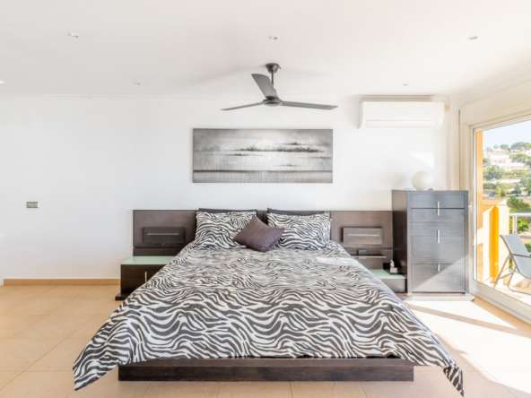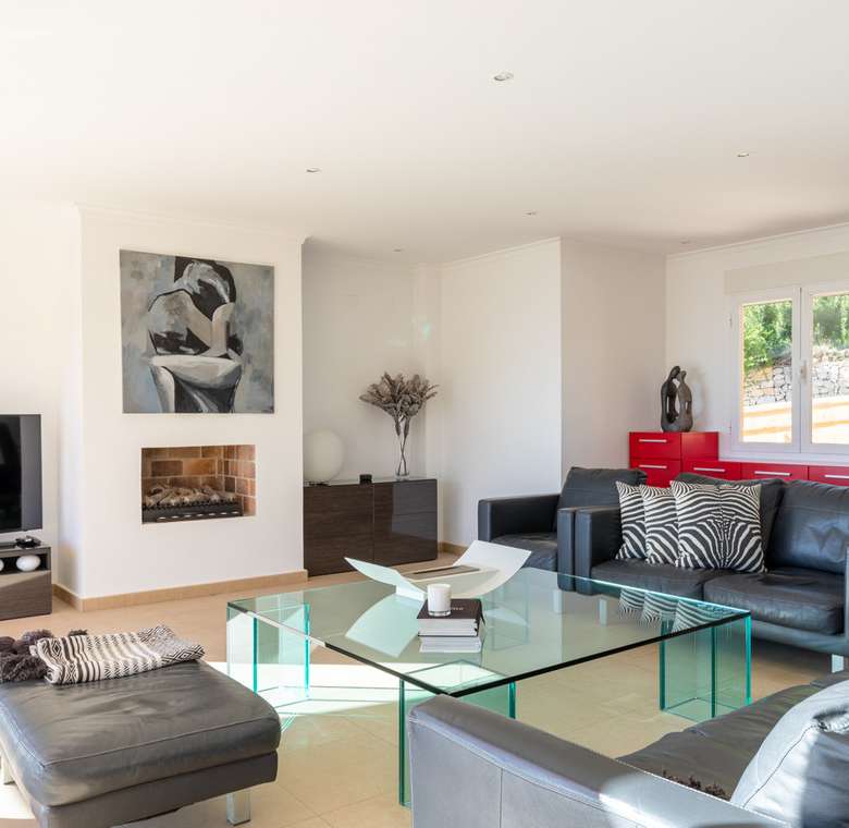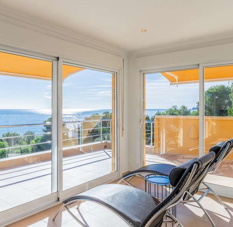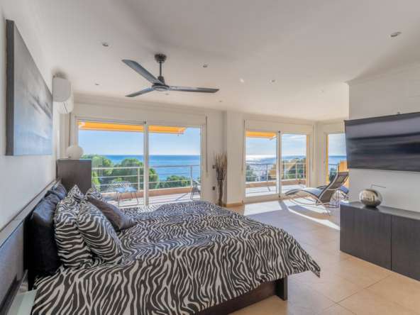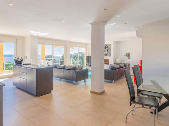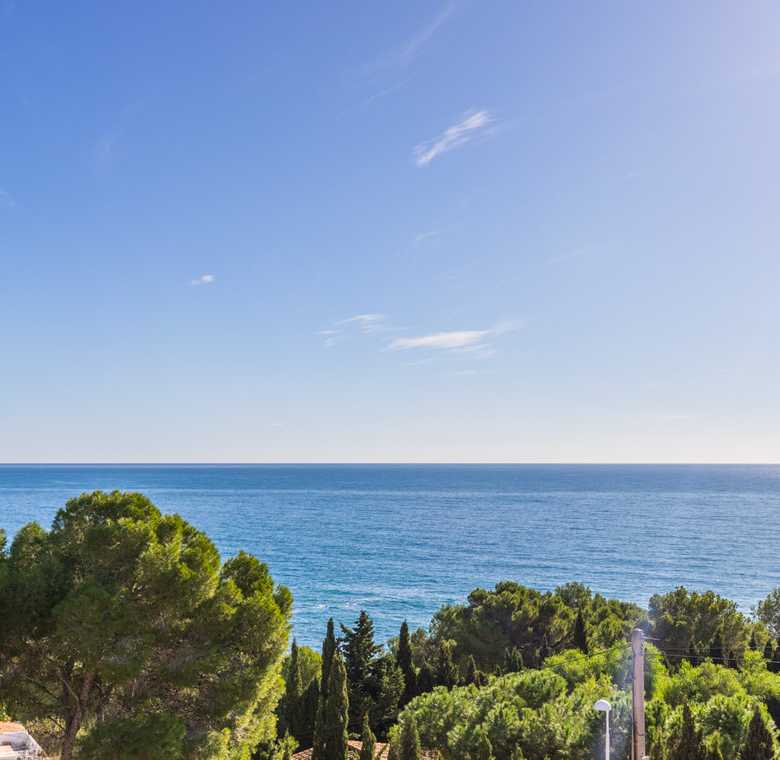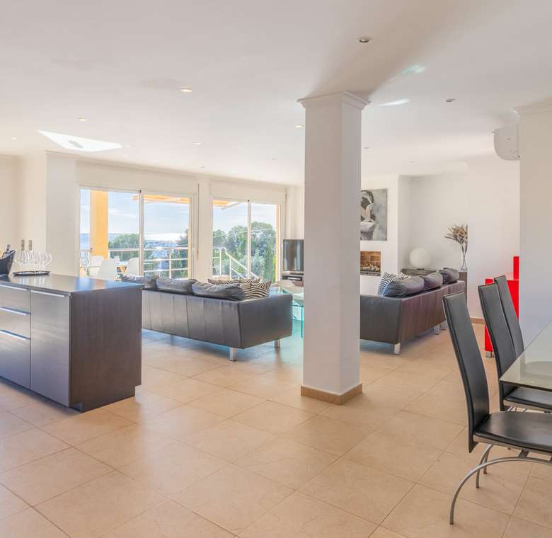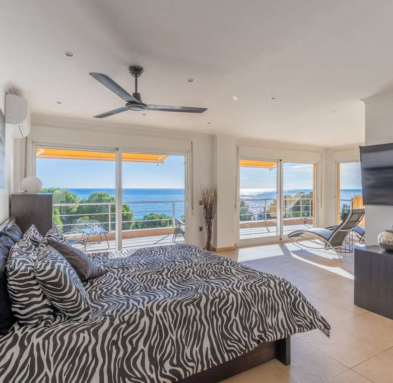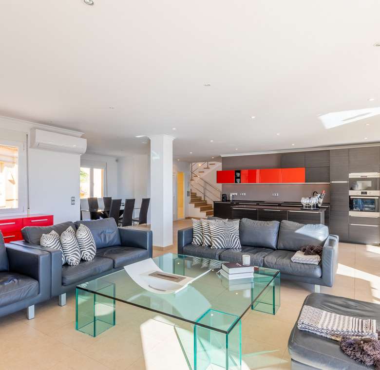 Destacan las increíbles vistas panorámicas al mar desde la mayoría de las habitaciones y desde todas las terrazas, gozando de mucha privacidad. Desde la estupenda zona exterior con pergola de madera, donde podremos protegernos del calor estival y refrescarnos en la fabulosa piscina infinity imaginando que estamos flotando el mismo mar Mediterráneo. El salón principal es muy espacioso, consta de una sala de estar de planta abierta con chimenea, comedor y cocina moderna totalmente equipada. Arriba encontramos la suite principal con las mejores vistas de toda la casa, con acceso exterior a una terraza privada y un amplio baño en suite con ducha y bañera de hidromasaje. El alojamiento para invitados consta de una sala de estar de planta abierta y una cocina totalmente equipada. Tiene dos habitaciones dobles con baño y una terraza privada y zona de descanso.