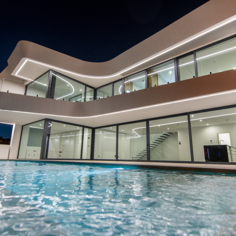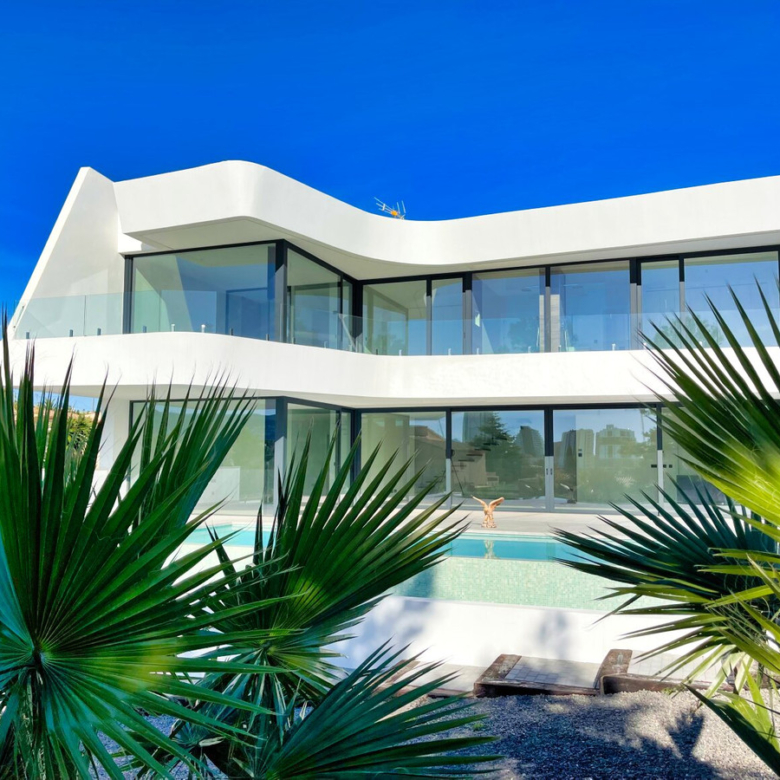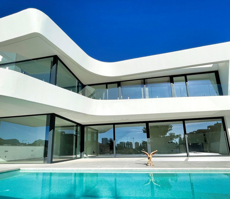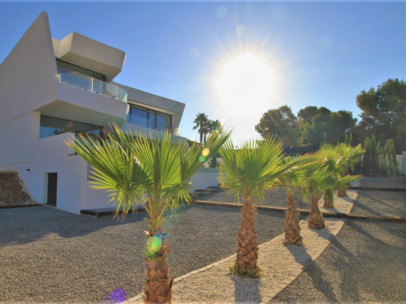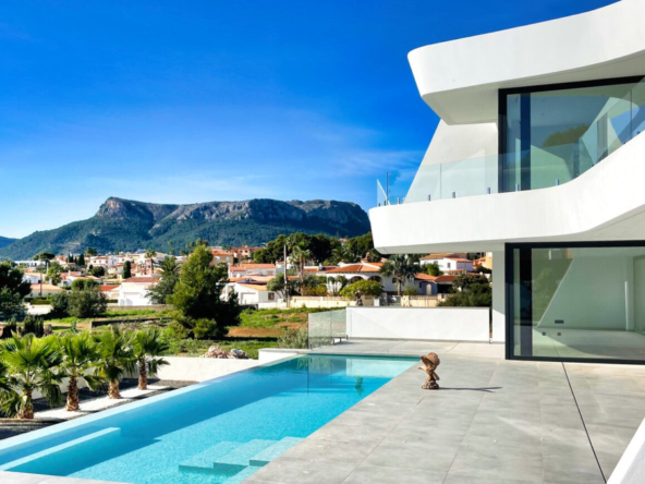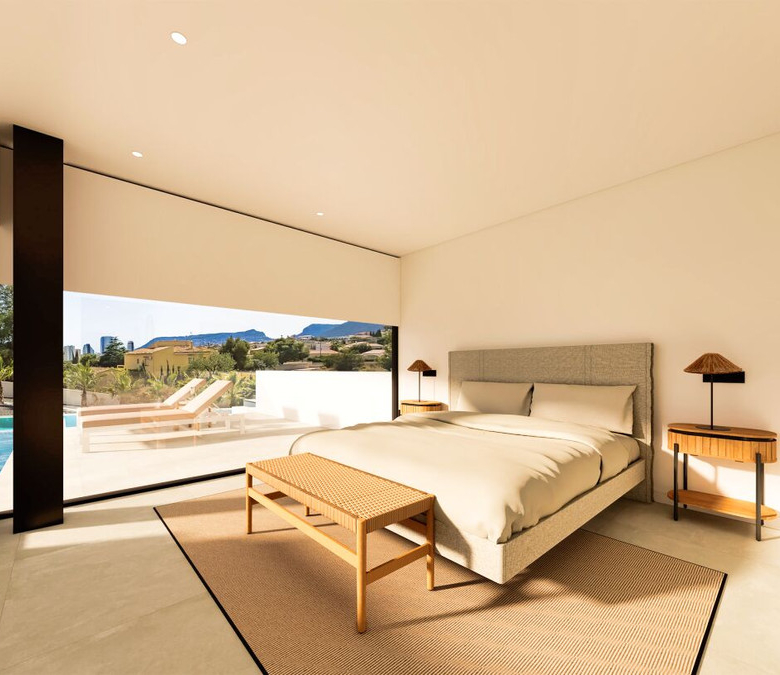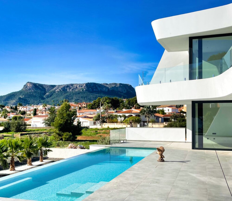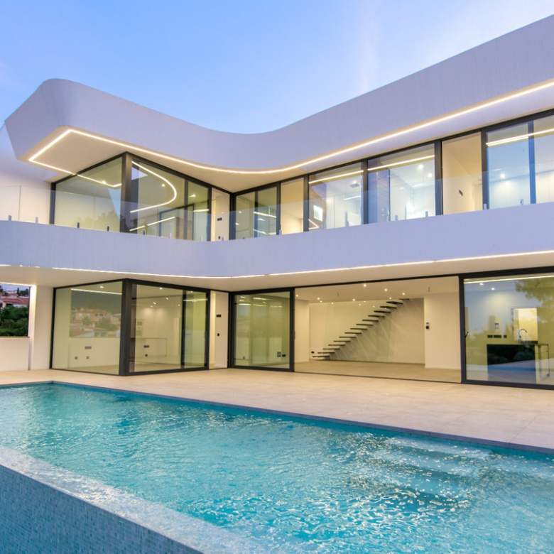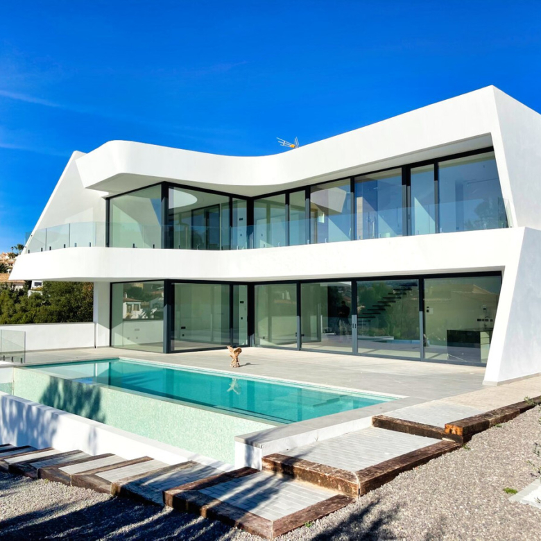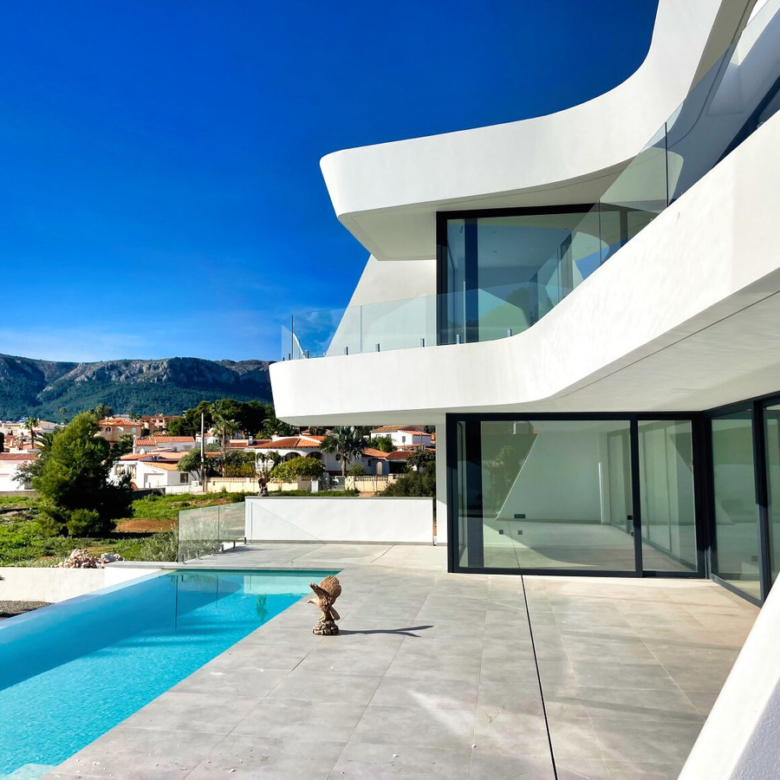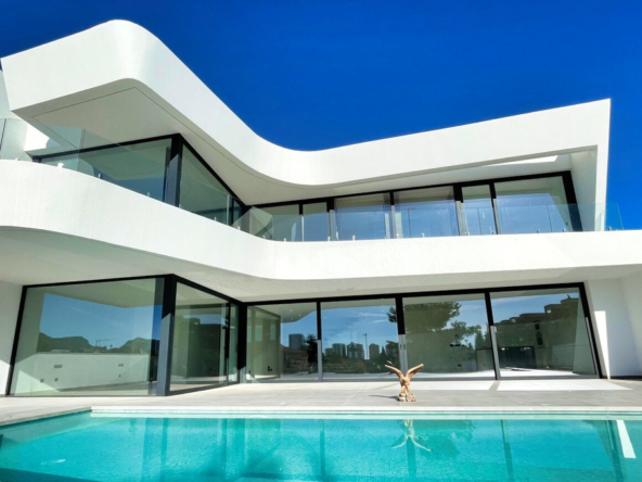 Esta villa moderna se encuentra en una zona privilegiada de Calpe, a tan sólo 15 minutos andando de la preciosa playa de arena blanca Poniente Arenal Bol y de todos los servicios. La propiedad se haya sobre una parcela de esquina de 920m2 y consta de 303m2 distribuidos en 2 plantas. Destacar de este fabuloso inmueble sus excelentes calidades y acabados y su funcional diseño.La planta baja alberga un amplio espacio diáfano (57,45m2) que comprende el salón comedor y la cocina moderna totalmente equipada. En esta planta se encuentra también un espacioso dormitorio (24m2) con cuarto de baño en suite, un aseo de cortesía y adyacente a la cocina un lavadero. La zona exterior goza de una magnífica piscina infinita de 59,55m2, porche con barbacoa integrada y terraza abierta para disfrutar del sol.La planta alta comprende 3 dormitorios con cuarto de baño en suite y acceso a una soleada terraza. La villa está equipada, entre otros de suelo radiante, sistema de climatización por conductos y pavimentos porcelánicos de gran formato. Cuenta con un aparcamiento cubierto de 33,35m2.