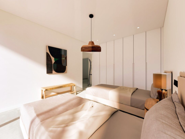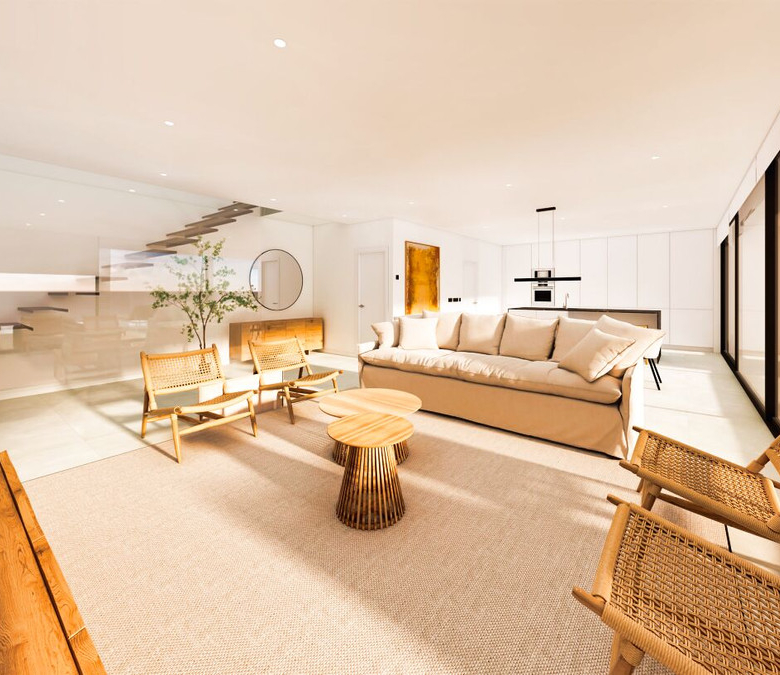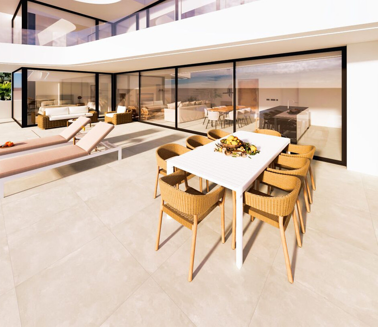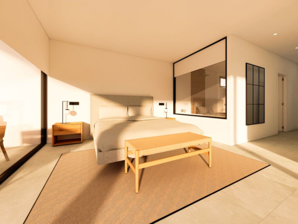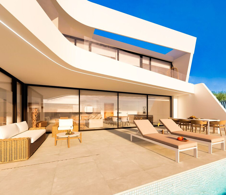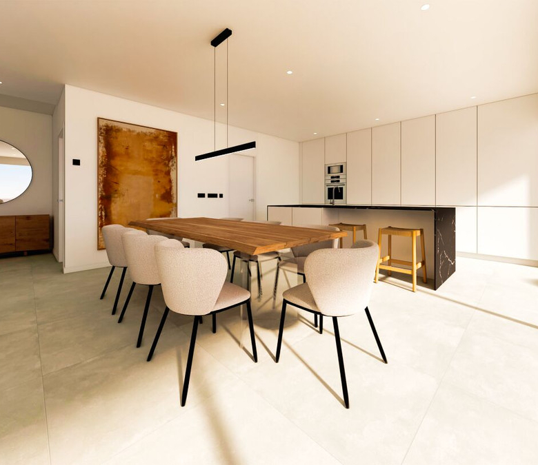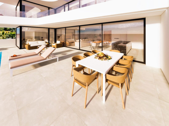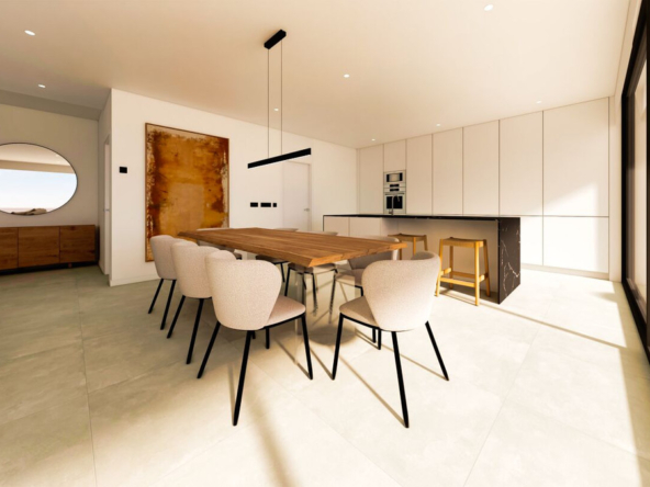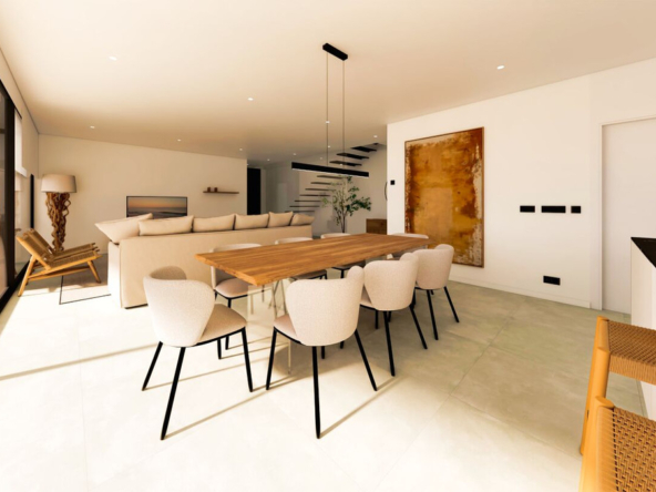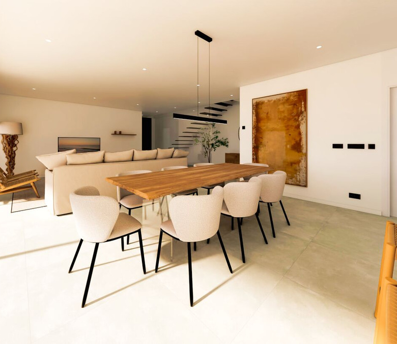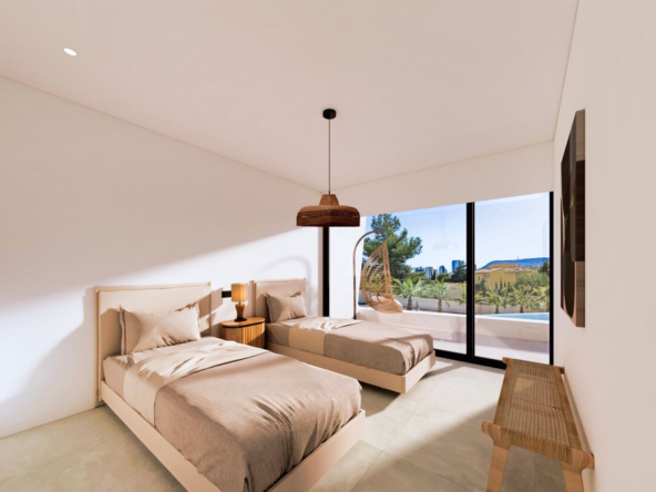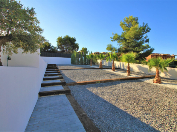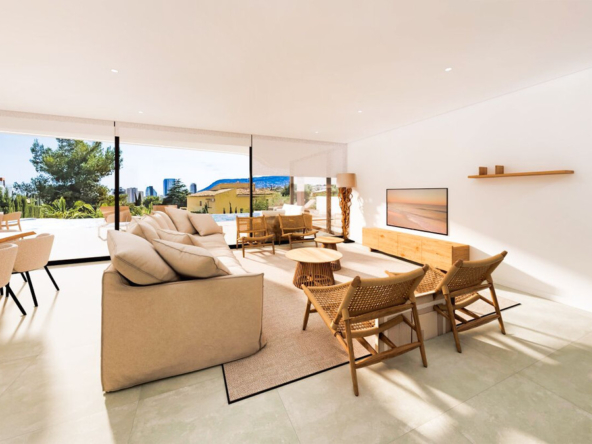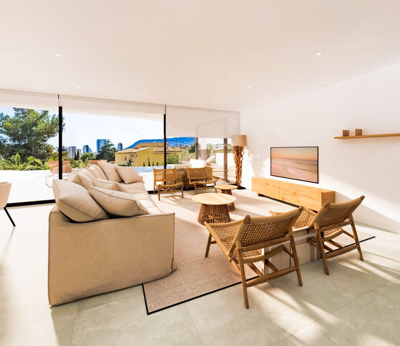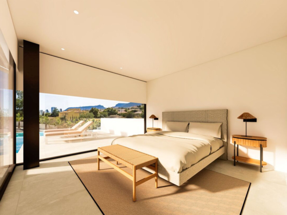 Esta villa moderna se encuentra en una zona privilegiada de Calpe, a tan sólo 15 minutos andando de la preciosa playa de arena blanca Poniente Arenal Bol y de todos los servicios. La propiedad se haya sobre una parcela de esquina de 920m2 y consta de 303m2 distribuidos en 2 plantas. Destacar de este fabuloso inmueble sus excelentes calidades y acabados y su funcional diseño.La planta baja alberga un amplio espacio diáfano (57,45m2) que comprende el salón comedor y la cocina moderna totalmente equipada. En esta planta se encuentra también un espacioso dormitorio (24m2) con cuarto de baño en suite, un aseo de cortesía y adyacente a la cocina un lavadero. La zona exterior goza de una magnífica piscina infinita de 59,55m2, porche con barbacoa integrada y terraza abierta para disfrutar del sol.La planta alta comprende 3 dormitorios con cuarto de baño en suite y acceso a una soleada terraza. La villa está equipada, entre otros de suelo radiante, sistema de climatización por conductos y pavimentos porcelánicos de gran formato. Cuenta con un aparcamiento cubierto de 33,35m2.