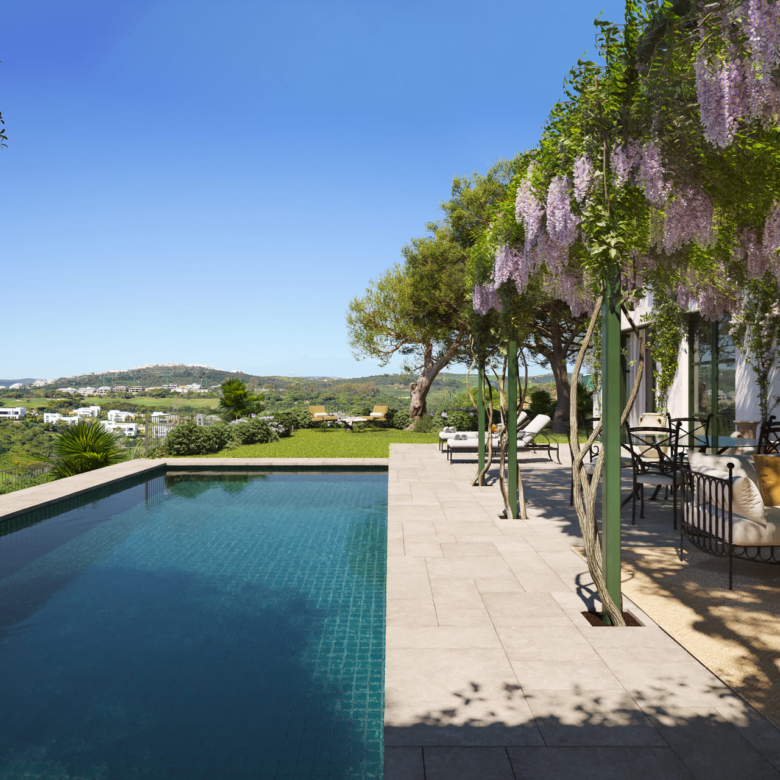 El diseño exterior de las villas en Casares está pensado para maximizar el disfrute del clima mediterráneo. Cada propiedad cuenta con un jardín privado, perfecto para quienes aprecian la naturaleza y el aire libre. Además, las villas disponen de una terraza, un espacio ideal para relajarse o entretener a los invitados mientras se disfruta de las vistas. La inclusión de una piscina privada en cada villa añade un toque de lujo y exclusividad, permitiendo a los residentes disfrutar de un refrescante baño en la privacidad de su hogar.