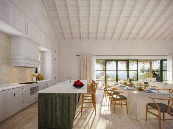 El interior de las villas está diseñado con un enfoque en la comodidad y la modernidad. Los suelos de gres porcelánico aportan un toque elegante y son fáciles de mantener. Las villas están equipadas con calefacción por suelo radiante, garantizando un ambiente cálido y acogedor durante todo el año. Las persianas eléctricas y el sistema de domótica ofrecen un control total sobre el ambiente del hogar. La cocina está equipada con electrodomésticos modernos, y los armarios empotrados proporcionan un amplio espacio de almacenamiento. Con tres dormitorios y tres baños, estas villas ofrecen un espacio generoso y bien distribuido para toda la familia.
