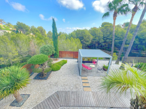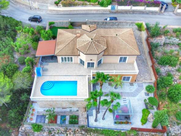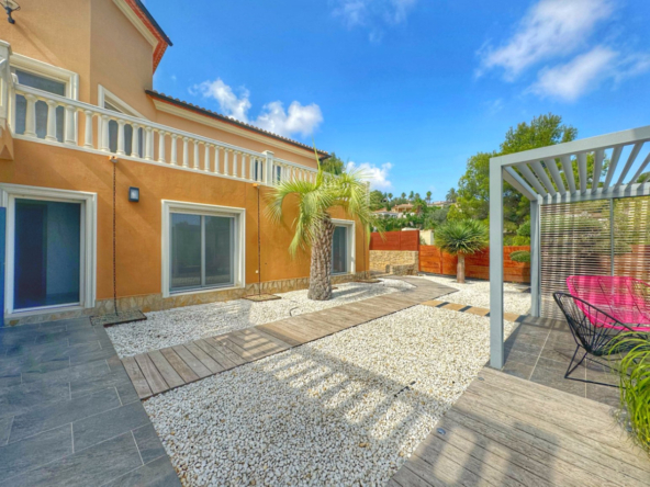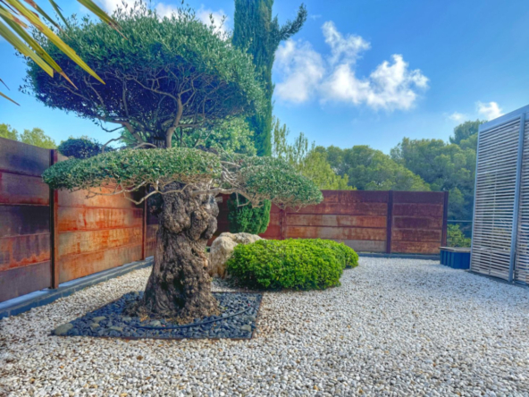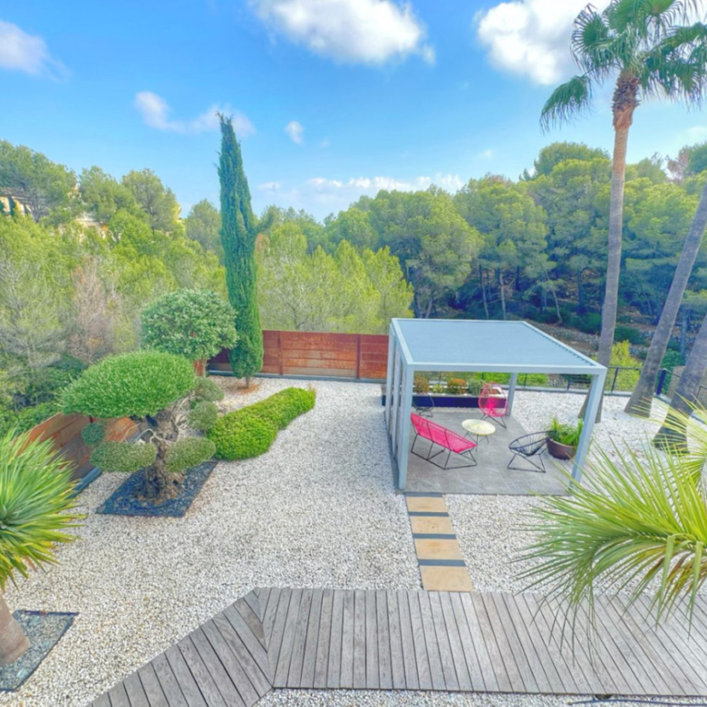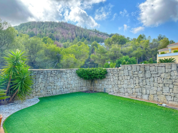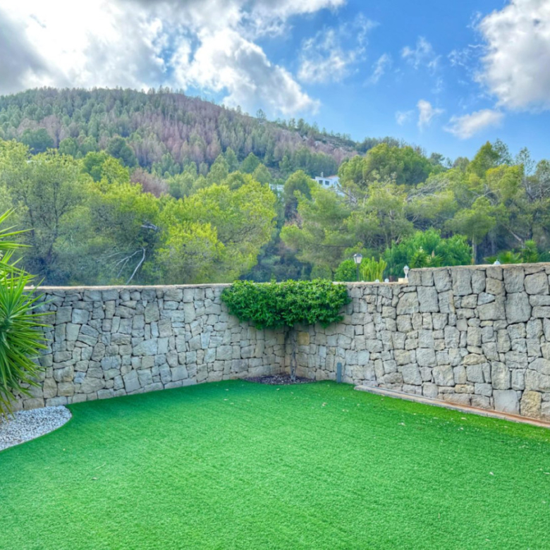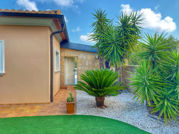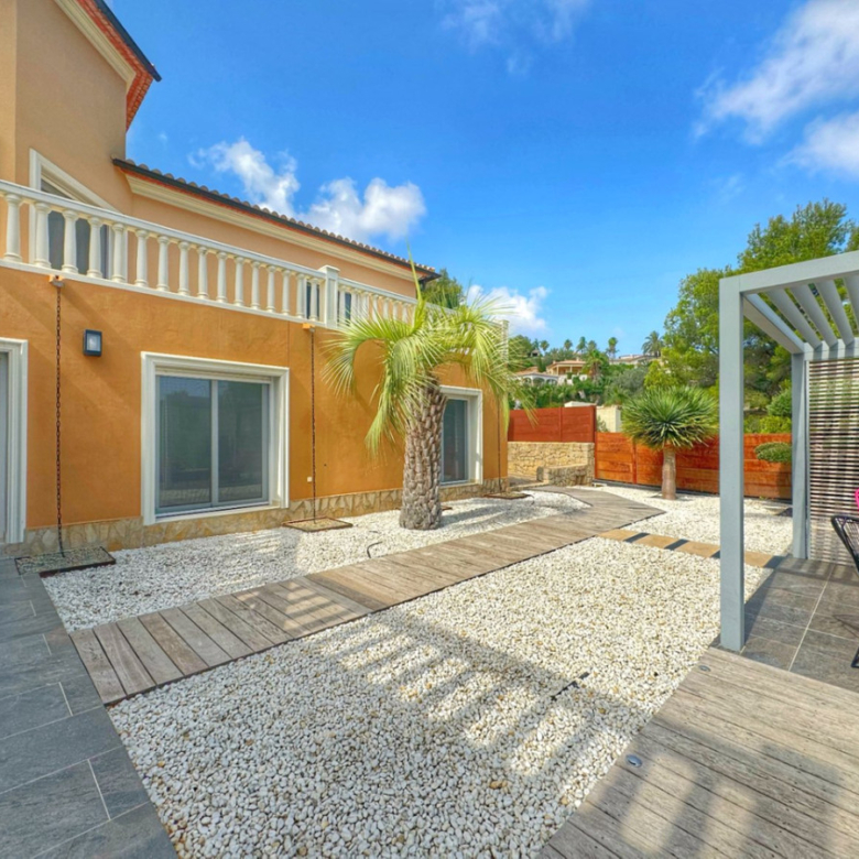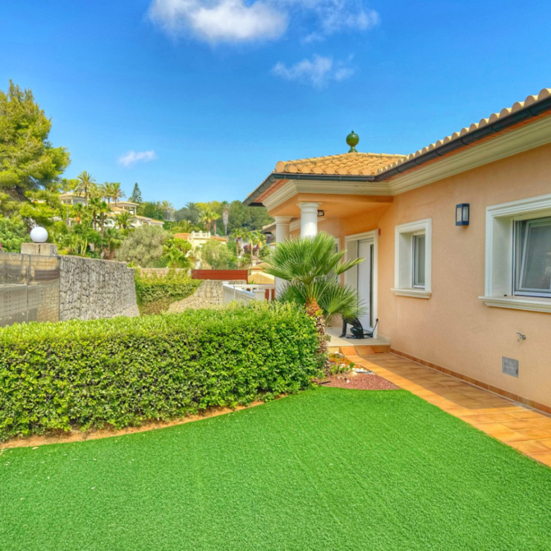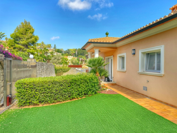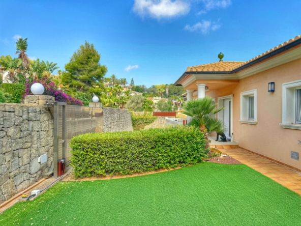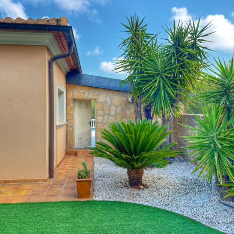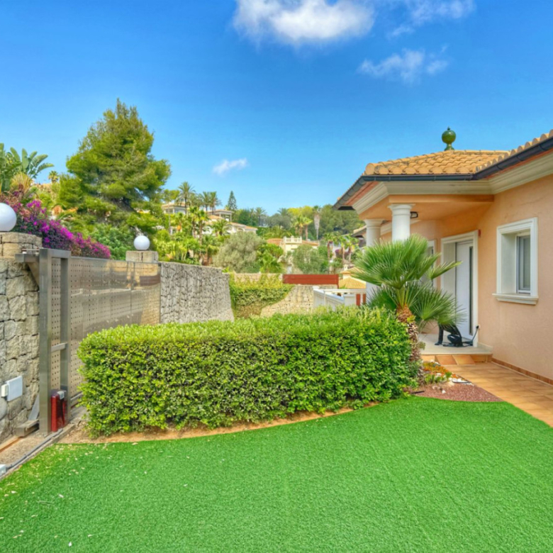 El exterior de la villa es un auténtico oasis mediterráneo, con un jardín diseñado con esmero y equipado con sistema de riego automático, donde cada detalle ha sido cuidadosamente pensado para ofrecer un entorno de paz y armonía.