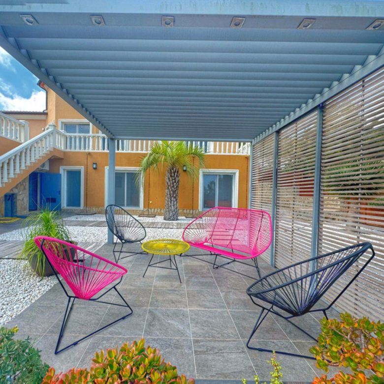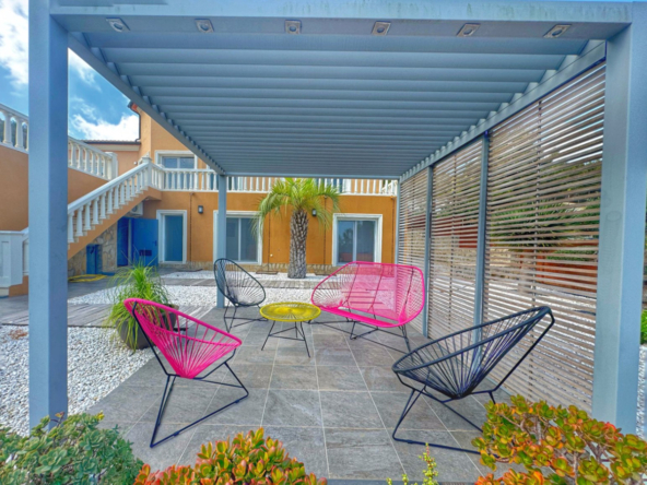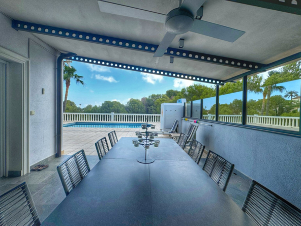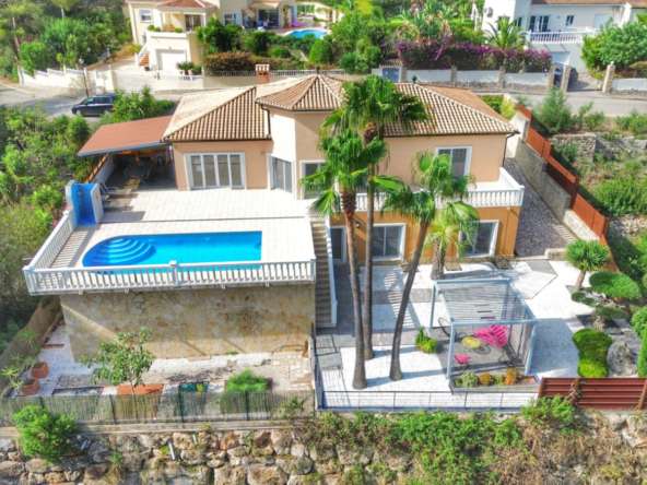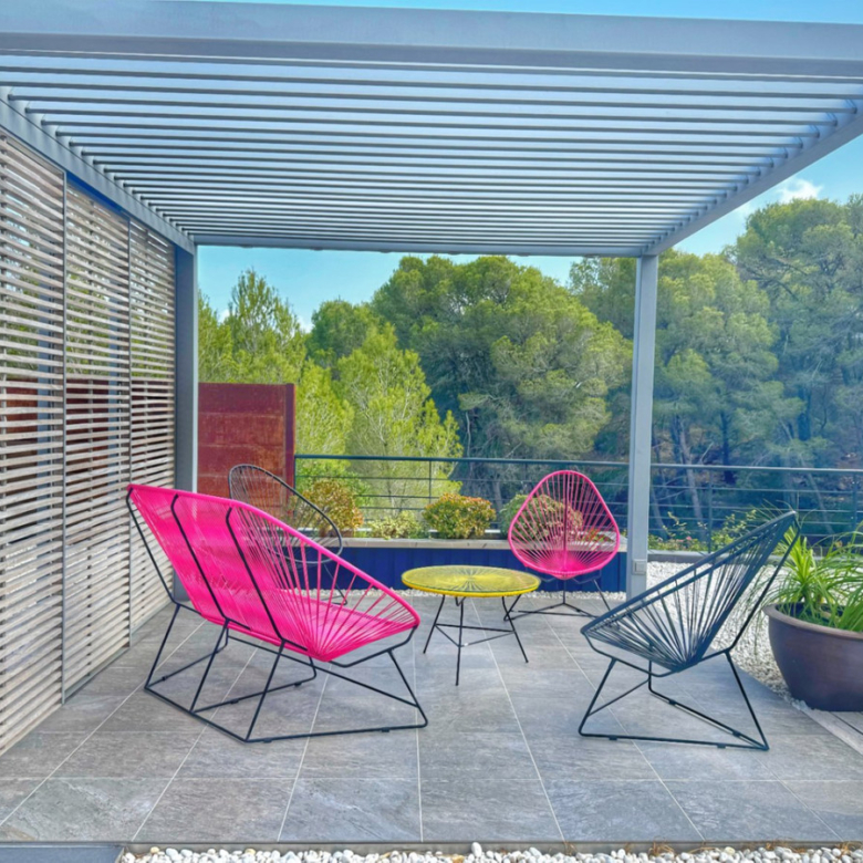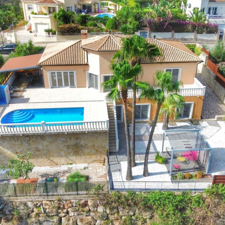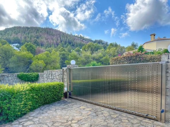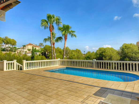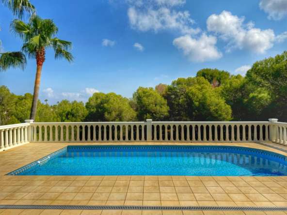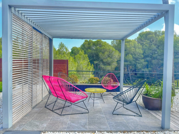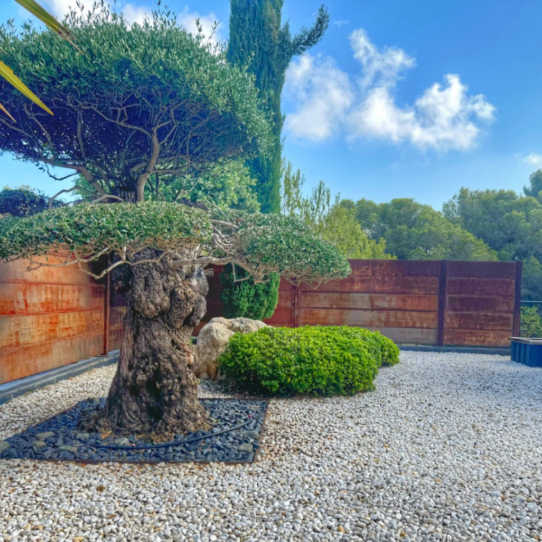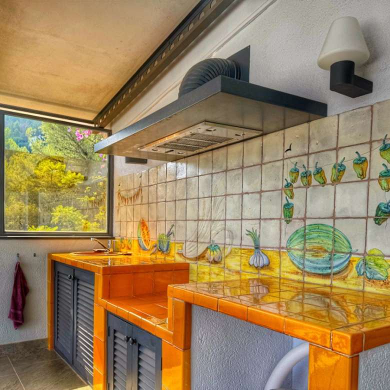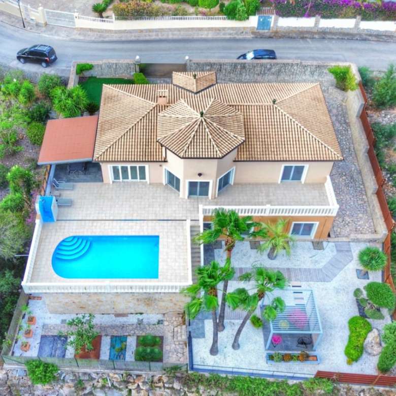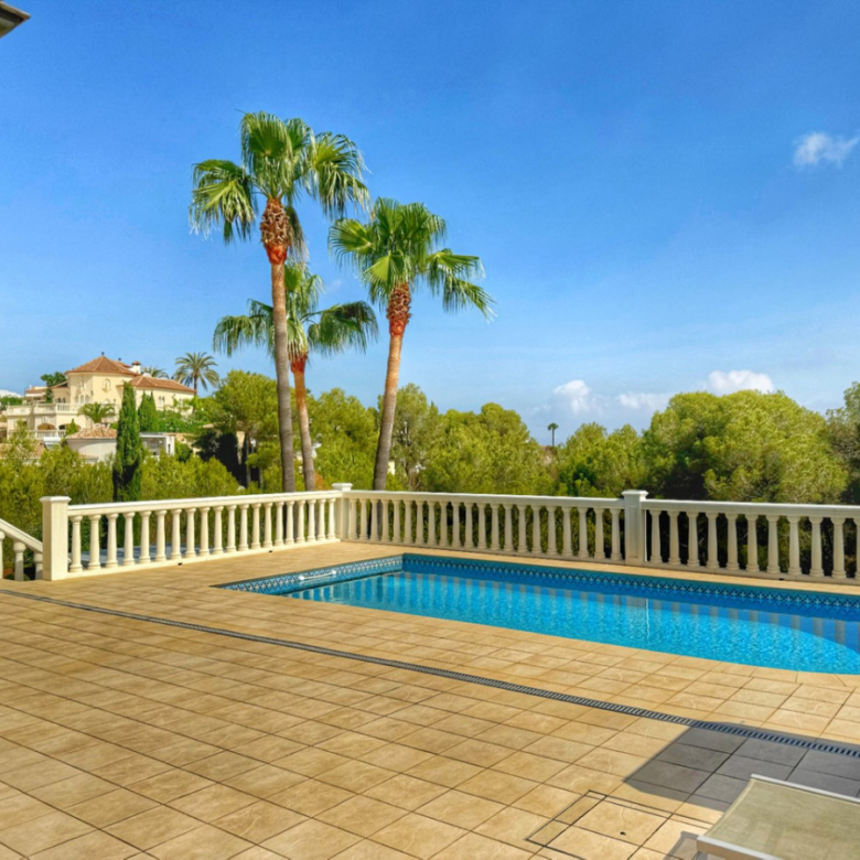 El exterior de la villa es un auténtico oasis mediterráneo, con un jardín diseñado con esmero y equipado con sistema de riego automático, donde cada detalle ha sido cuidadosamente pensado para ofrecer un entorno de paz y armonía.