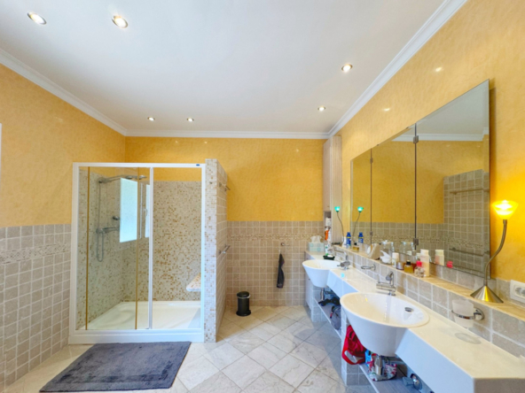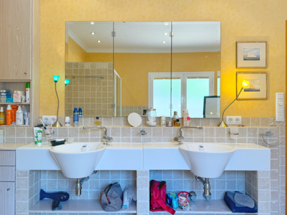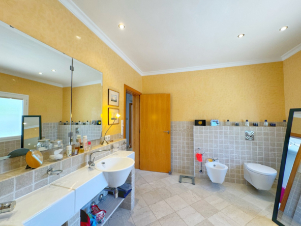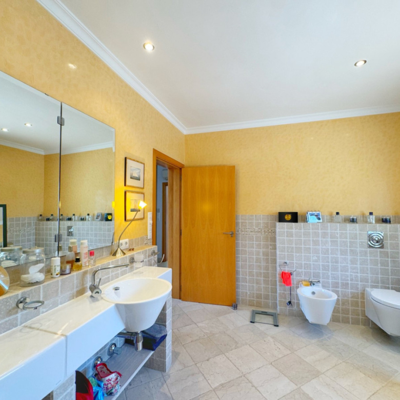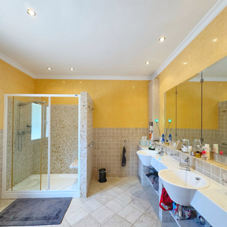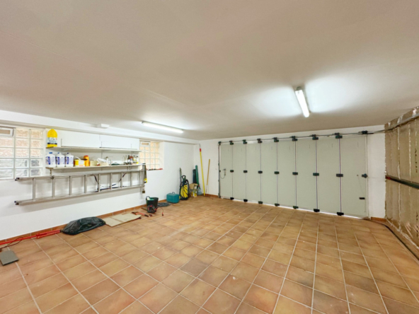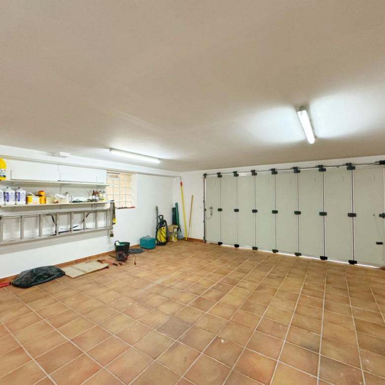La planta inferior, a la que se accede desde el salón o desde el amplio garaje para dos vehículos, está diseñada para ofrecer el máximo confort. Aquí, se encuentran dos dormitorios adicionales, uno de ellos formando parte de un apartamento independiente para invitados, con su propio baño, cocina, salón-comedor y acceso directo al jardín. Además, el segundo dormitorio cuenta con baño en suite. Esta planta incluye también una completa lavandería con armarios empotrados, sala de máquinas, y una piscina cubierta climatizada con sistema de agua a contracorriente, ducha de hidromasaje y deshumidificador, creando un espacio único para el relax y el bienestar.