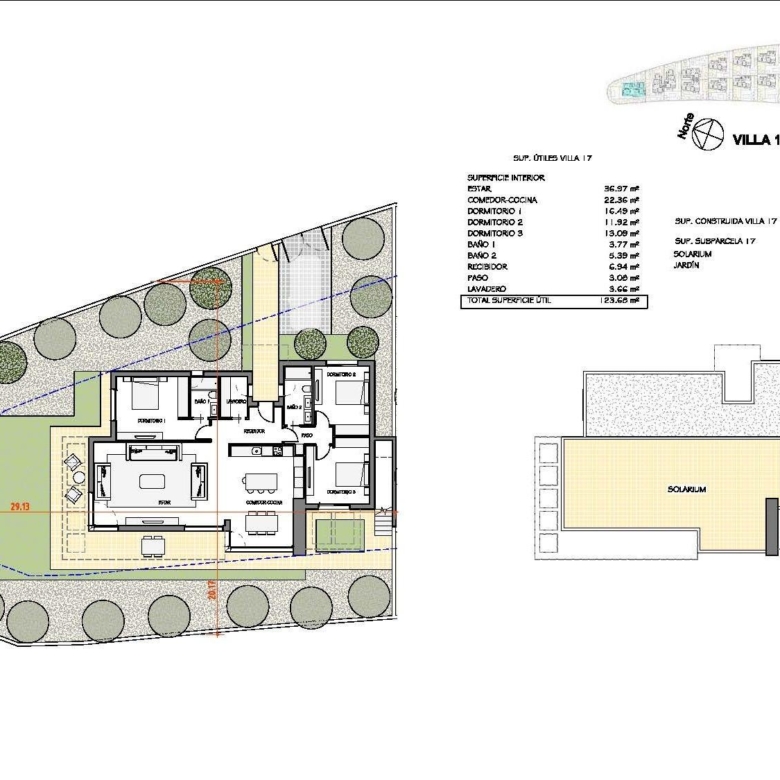 El residencial está compuesto por 17 villas en parcelas a partir de 300 m2. Podrá elegir entre viviendas con 2 o 3 dormitorios y 2 baños completos en una sola planta, además de una zona de terraza con piscina privada de 6×2.4 y un solarium privado en la azotea.