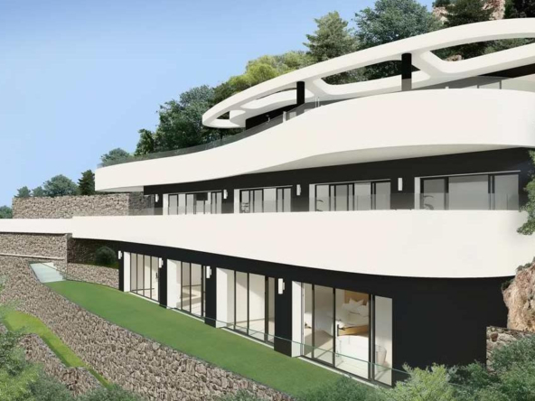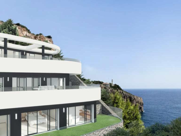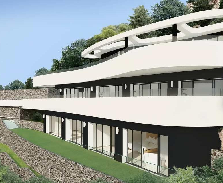 Villa moderna y minimalista de nueva construcción en Cala Ambolo en Jávea, con espectaculares vistas sobre el mar Mediterráneo, en una parcela de 980m² con orientación sur.
