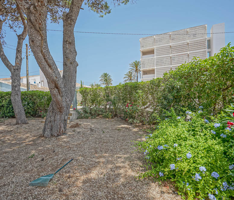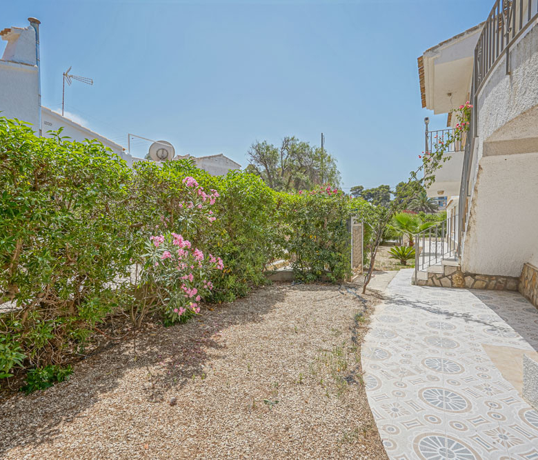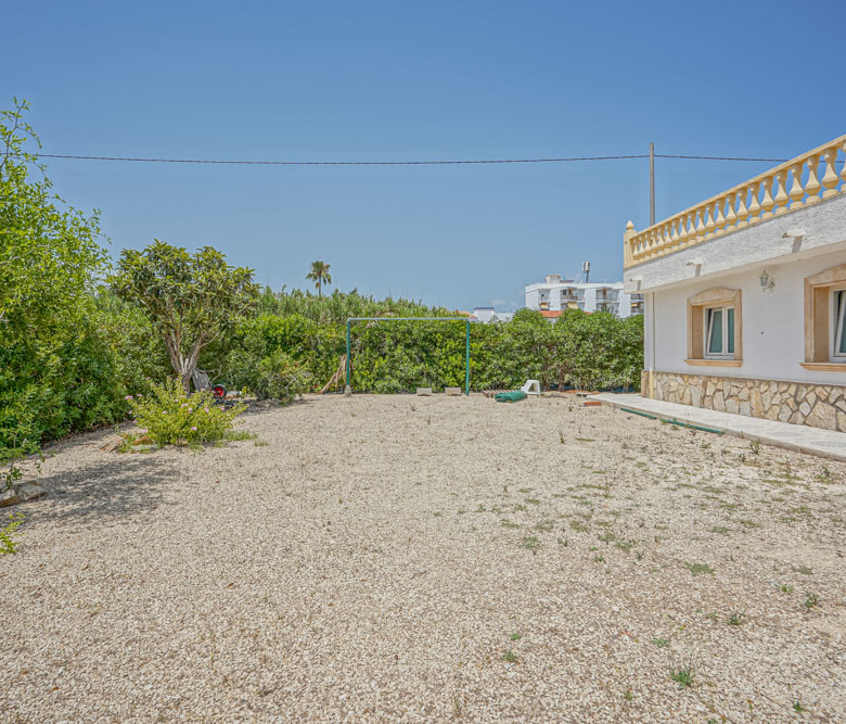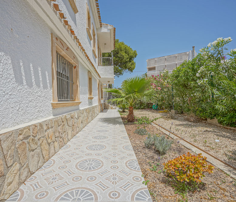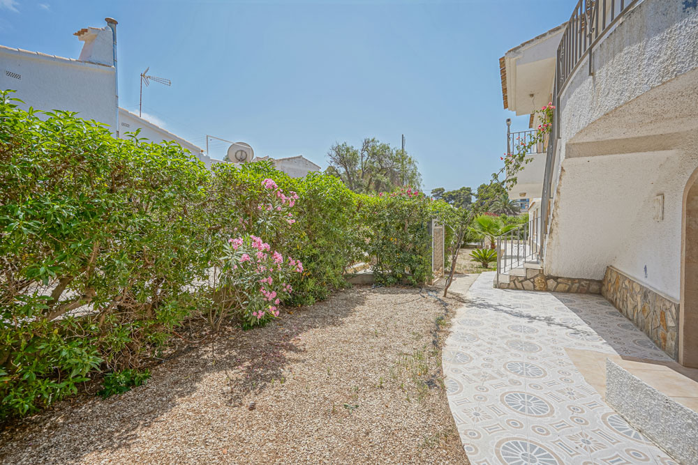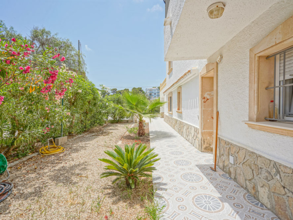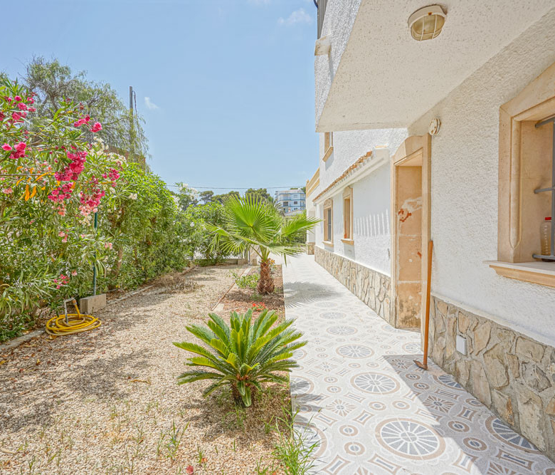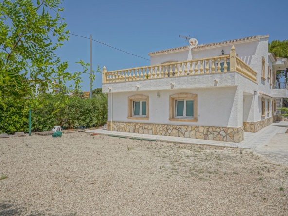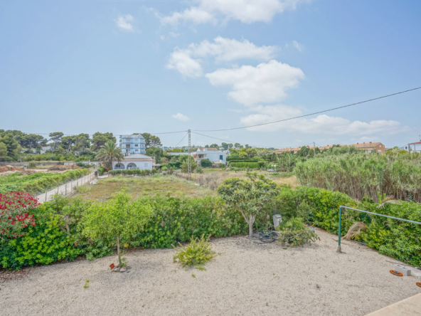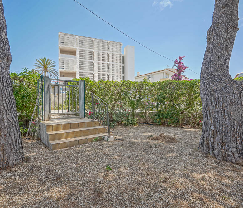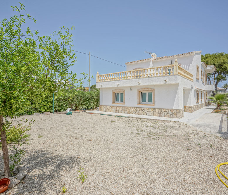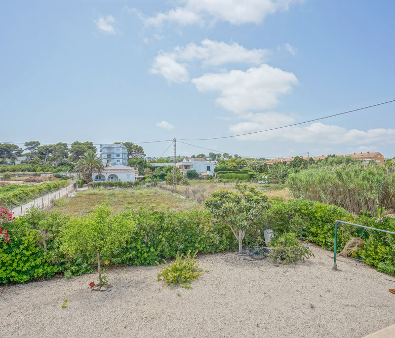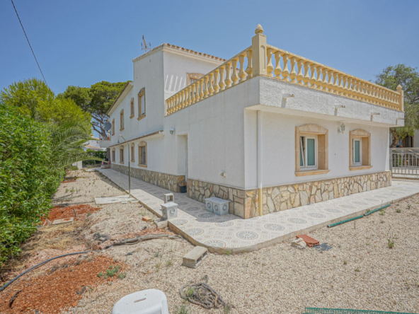 Esta gran villa está situada en una parcela llana de 1144 m2 a sólo 50 m de la hermosa playa de Cala Blanca. La villa está dividida en dos plantas casi idénticas. La planta baja consta de un salón-comedor, una cocina, tres dormitorios dobles, un baño y una terraza cubierta. La planta superior consta de un salón-comedor, una cocina, tres dormitorios dobles, dos baños, una terraza cubierta y un gran solarium de 40 m2 orientado al sur. También hay un garaje, una barbacoa, una ducha exterior, dos depósitos de agua de 16.000 litros para riego y acceso a un pozo comunal. La villa está rodeada por un jardín mediterráneo, con mucho espacio tanto en el lado sur como en el norte de la casa. En el lado norte hay varios pinos que, junto con la fresca brisa marina, hacen que nunca haga demasiado calor en la terraza cubierta. El lado sur, rodeado únicamente por un seto de flores y algunos árboles frutales, es ideal para disfrutar del sol en invierno o para instalar una piscina. La villa está a menos de 1,5 km de la playa de arena y del paseo marítimo del Arenal. Hay una farmacia y un colegio internacional a 300 m y un supermercado a 500 m. A sólo 100 m hay también un bar junto al mar.