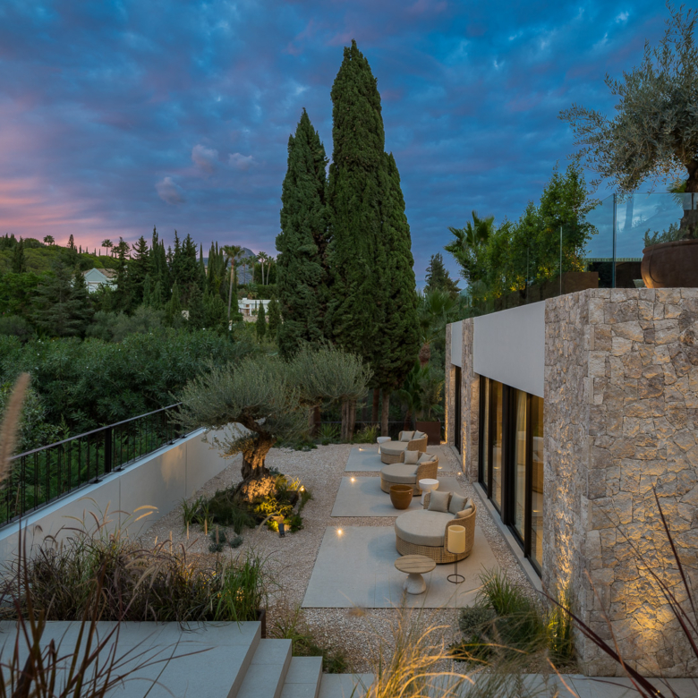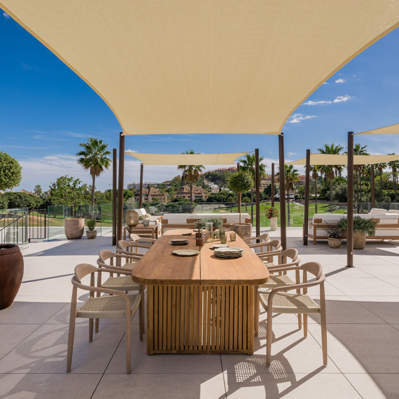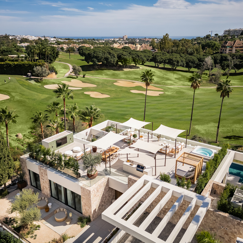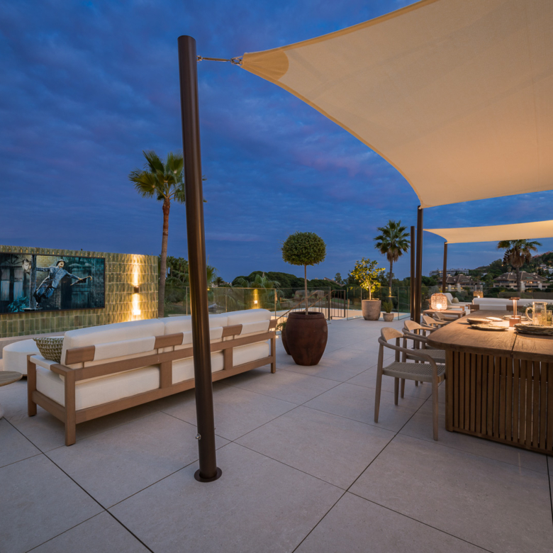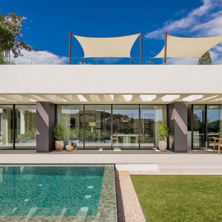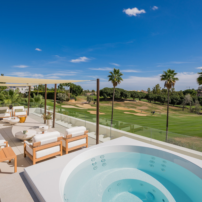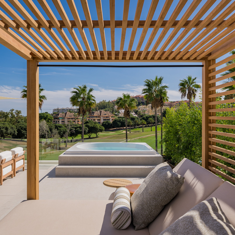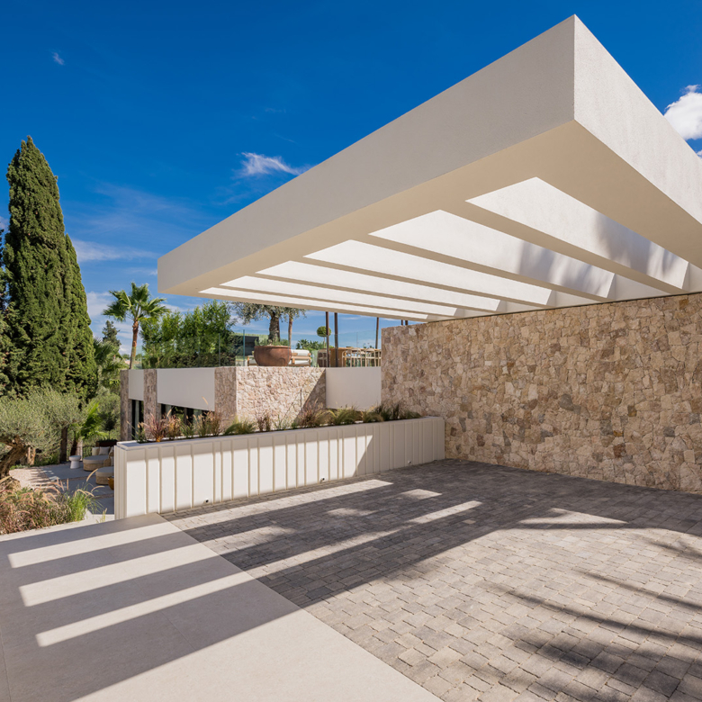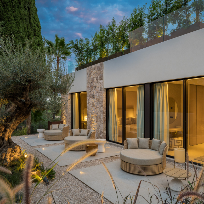 El exterior de la villa está diseñado para maximizar el disfrute del clima mediterráneo. Cuenta con un jardín privado que proporciona un oasis de tranquilidad y belleza natural. La piscina privada es perfecta para refrescarse durante los cálidos días de verano, mientras que el jacuzzi ofrece un espacio de relajación adicional. La terraza, equipada con una pérgola, es ideal para disfrutar de comidas al aire libre o simplemente relajarse mientras se contempla el entorno. Además, el solárium ofrece vistas panorámicas, convirtiéndose en un lugar privilegiado para disfrutar del atardecer.