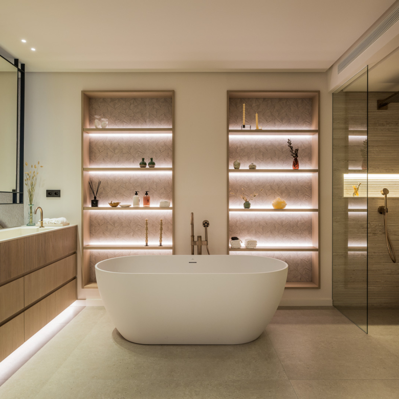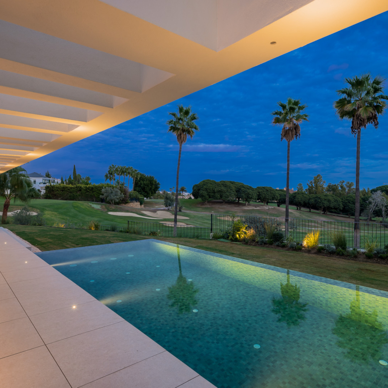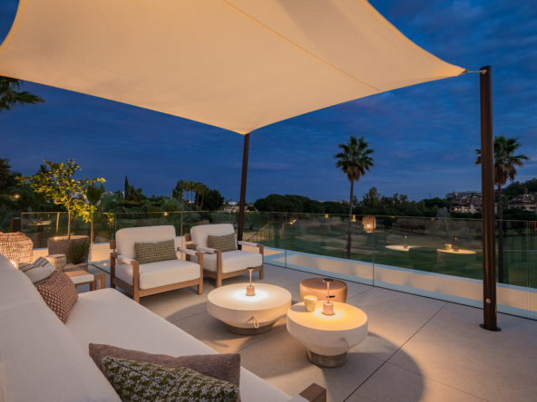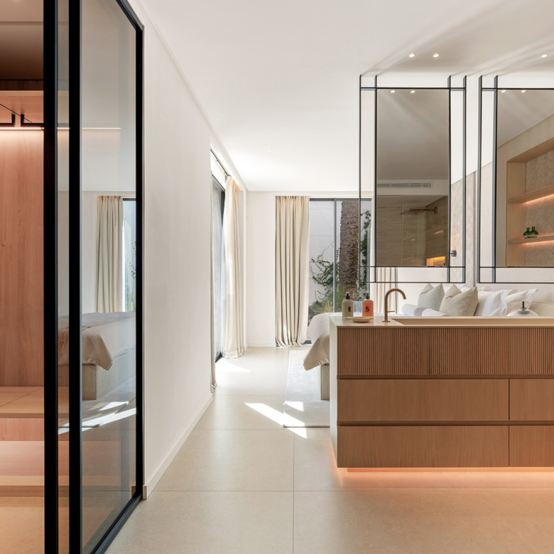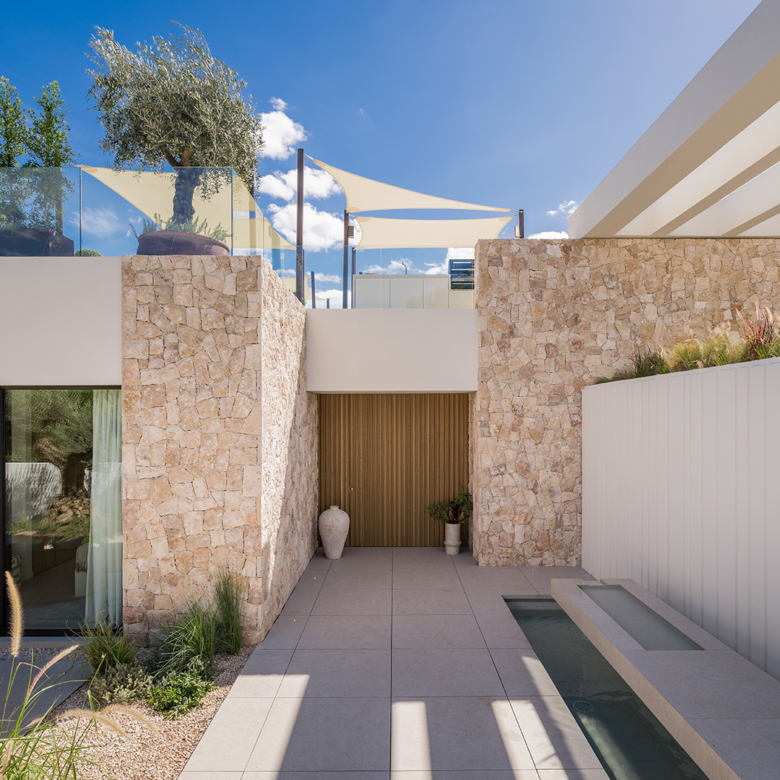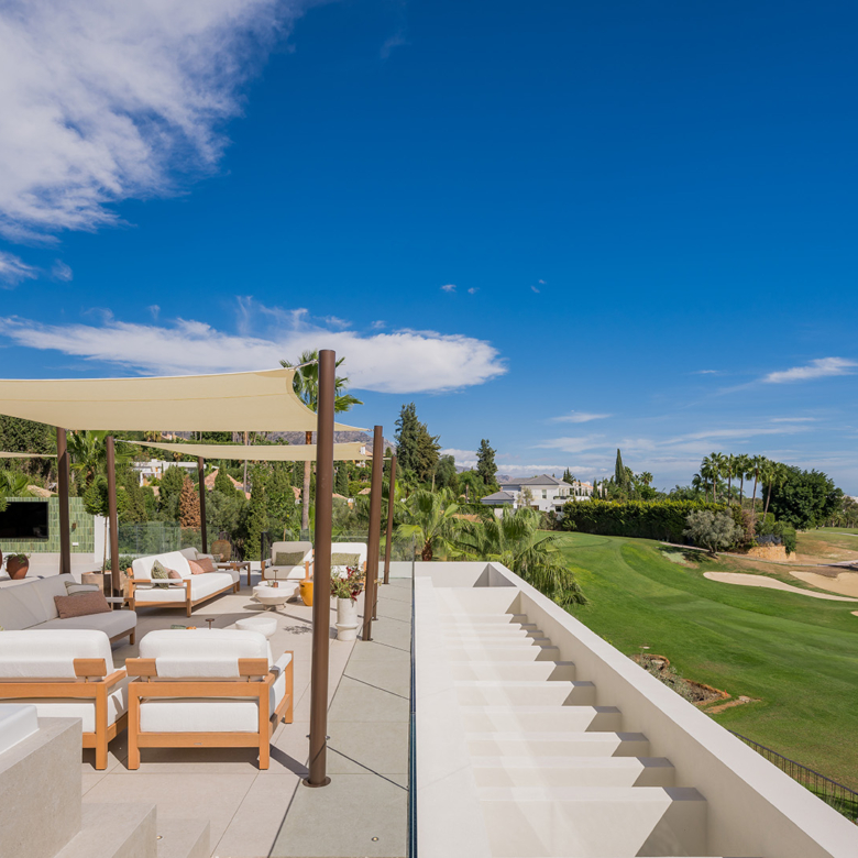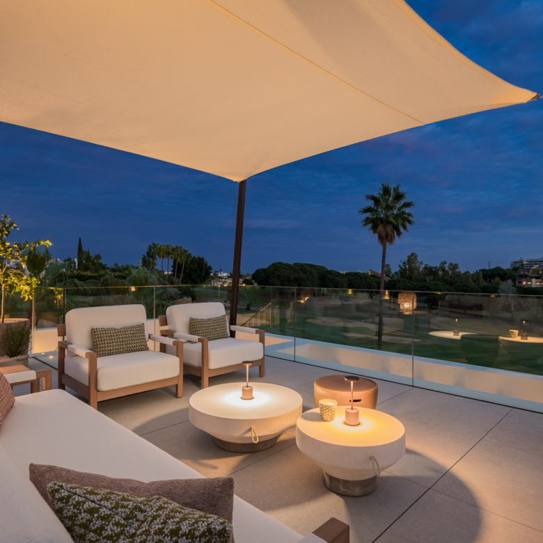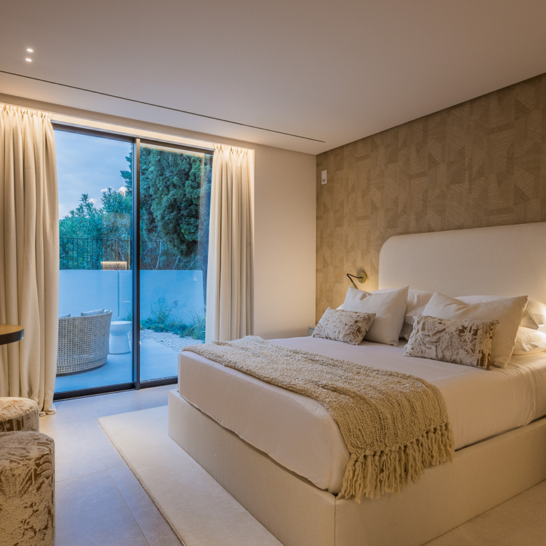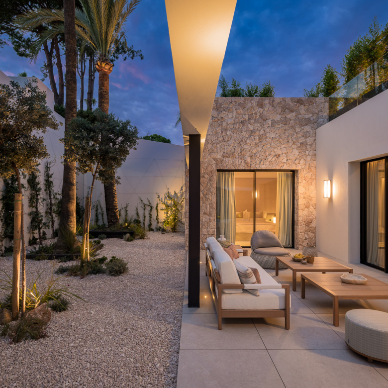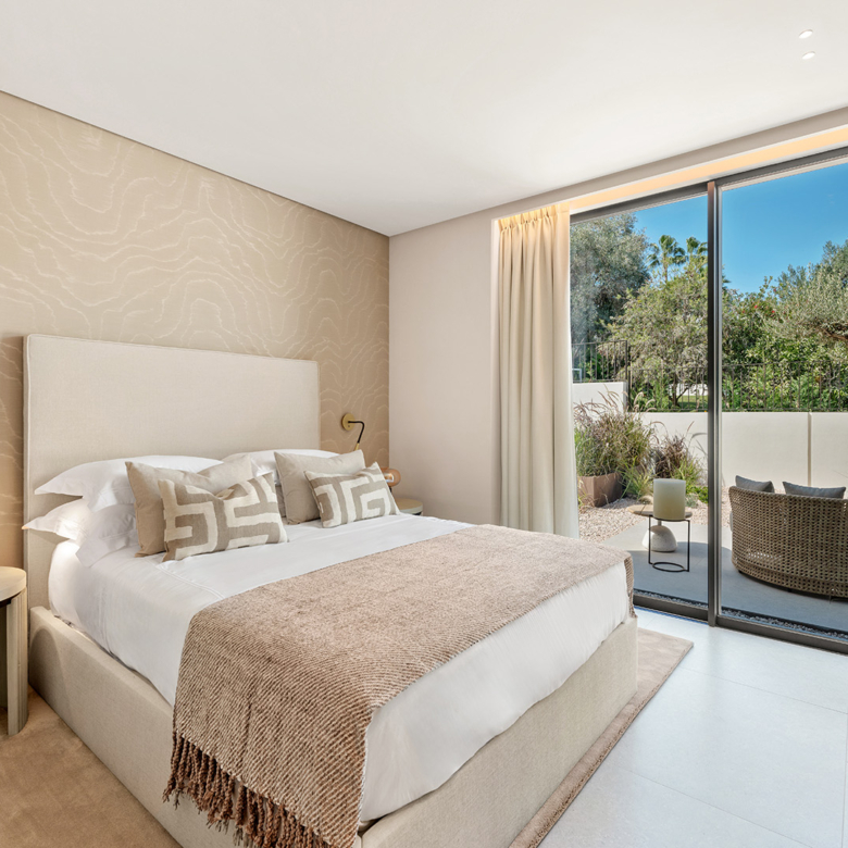 El exterior de la villa está diseñado para maximizar el disfrute del clima mediterráneo. Cuenta con un jardín privado que proporciona un oasis de tranquilidad y belleza natural. La piscina privada es perfecta para refrescarse durante los cálidos días de verano, mientras que el jacuzzi ofrece un espacio de relajación adicional. La terraza, equipada con una pérgola, es ideal para disfrutar de comidas al aire libre o simplemente relajarse mientras se contempla el entorno. Además, el solárium ofrece vistas panorámicas, convirtiéndose en un lugar privilegiado para disfrutar del atardecer.