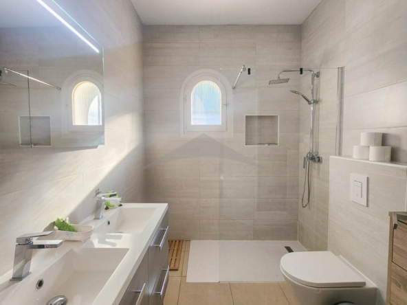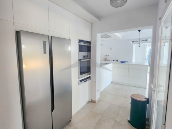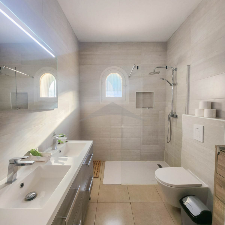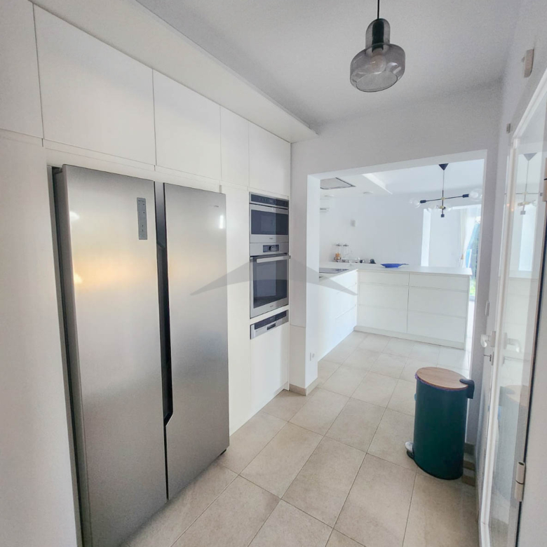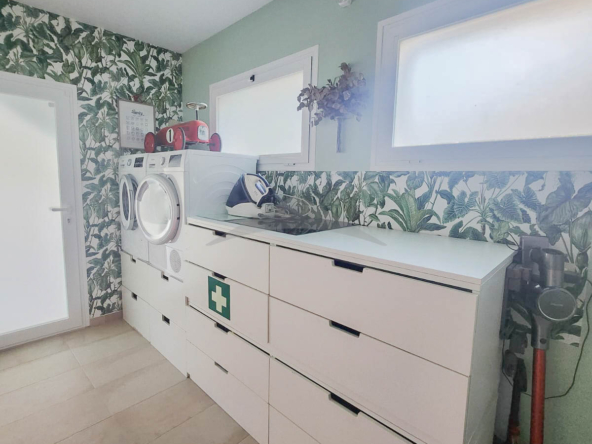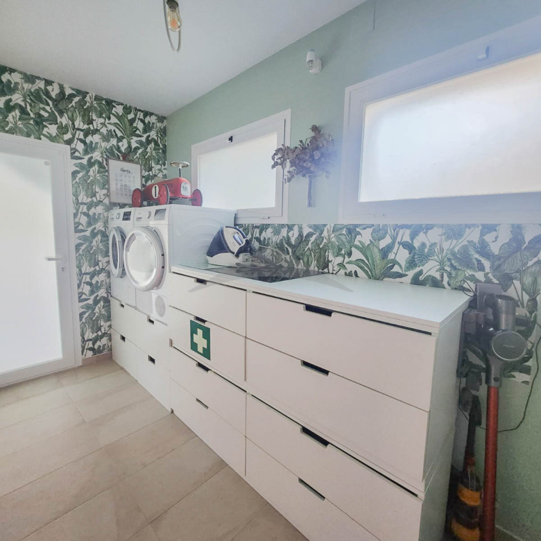 En la planta baja, la casa cuenta con una amplia cocina moderna totalmente equipada, ideal para los amantes de la gastronomía, un comedor luminoso perfecto para recibir a invitados, un práctico cuarto de lavado y un gran salón polivalente que puede convertirse en sala de cine o espacio de relajación.