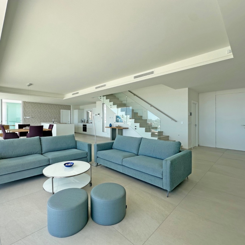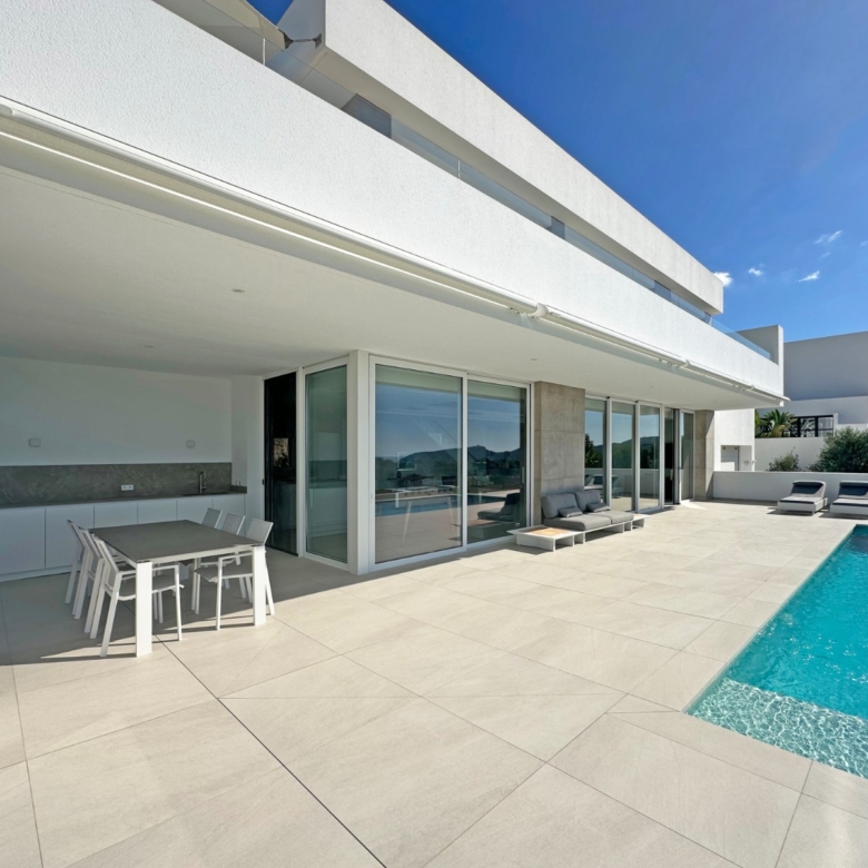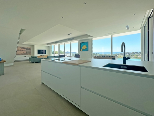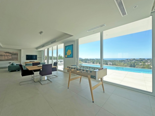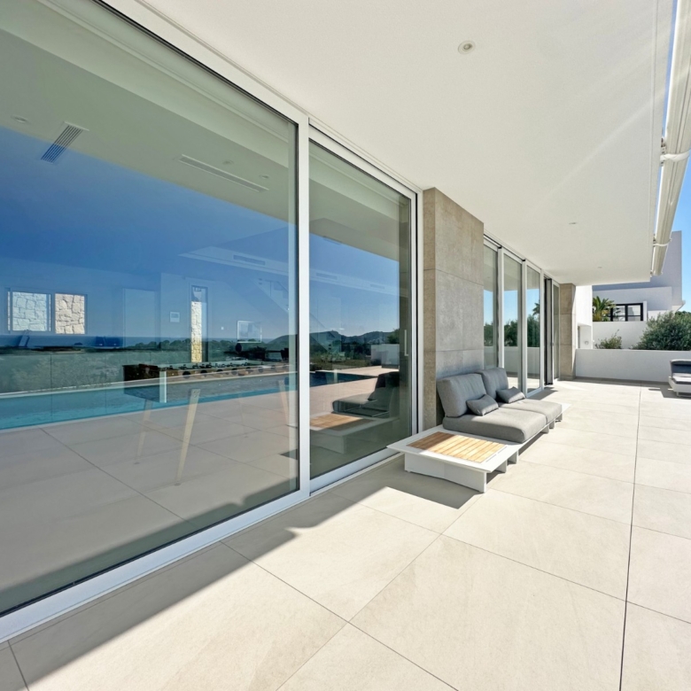Los grandes ventanales en la planta baja ofrecen vistas panorámicas al mar y acceso directo a la piscina, la terraza y la ducha exterior.