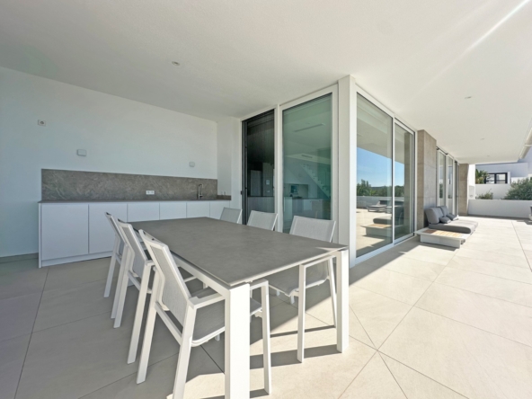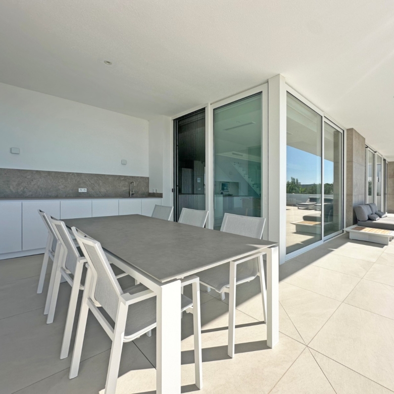 Desde el comedor, se accede a la cocina exterior cubierta y al comedor al aire libre, que en el lado oeste se puede cerrar con cortinas de cristal.