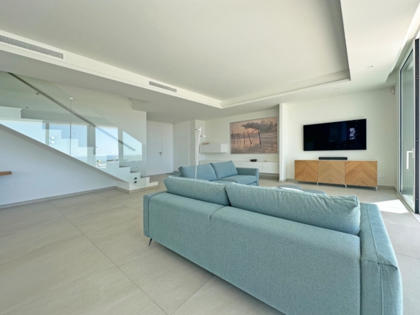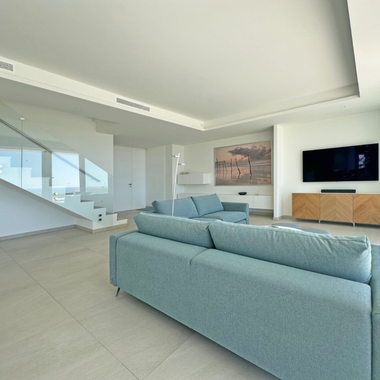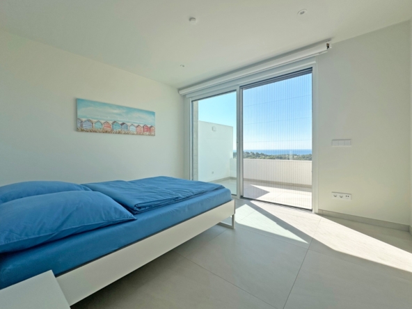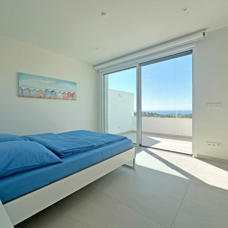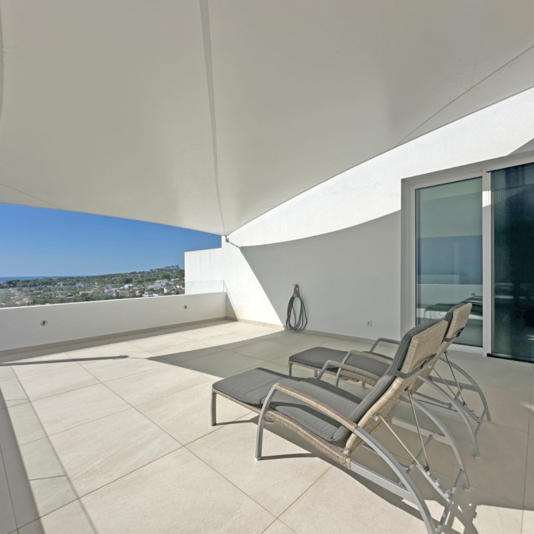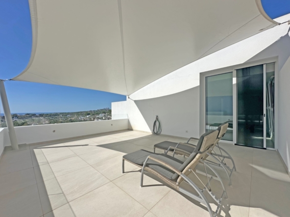 Todas las habitaciones tienen acceso a la terraza situada al suroeste, donde podrás relajarte bajo la sombra del toldo instalado y disfrutar de una amplia vista al mar y al paisaje circundante. Una segunda terraza de aproximadamente 40 m² está orientada al sureste.
