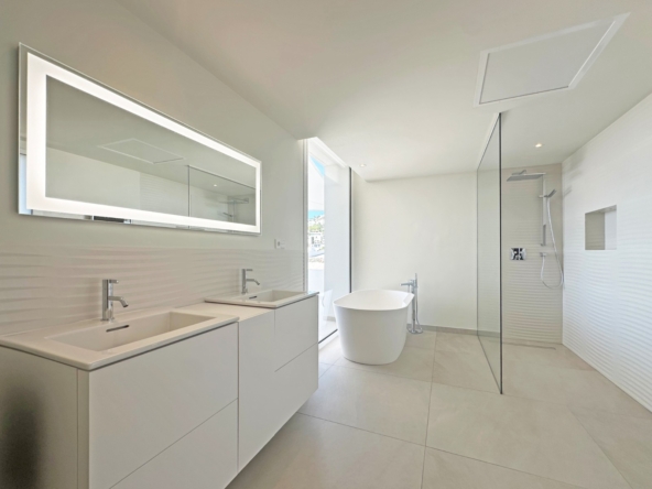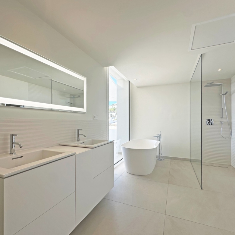 En la planta superior hay tres dormitorios y un baño adicional con ducha y bañera, desde donde podrás disfrutar de vistas al mar incluso mientras te duchas o te bañas.