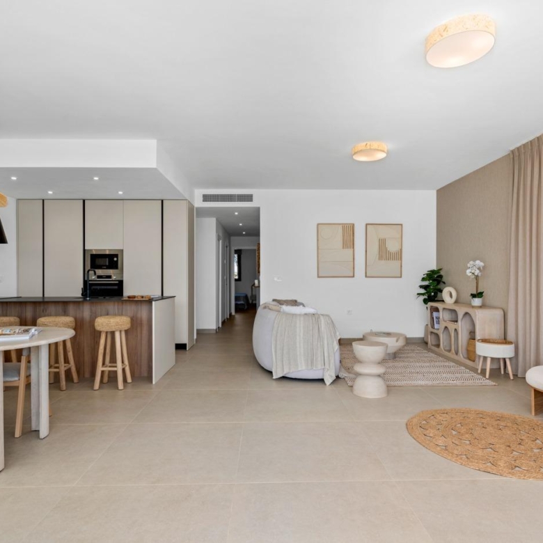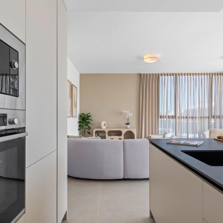 Les appartements ont un design moderne et présentent un espace de vie ouvert, combinant la cuisine, la salle à manger et le salon, dans un grand espace avec accès à la terrasse.