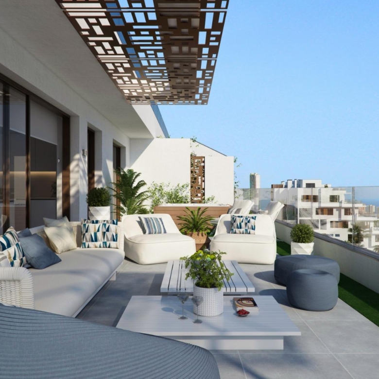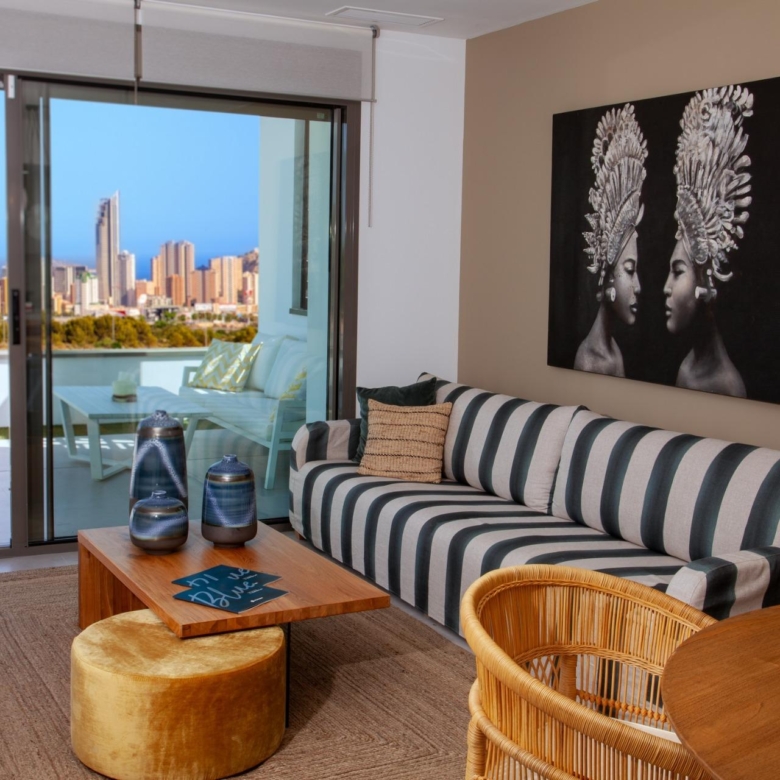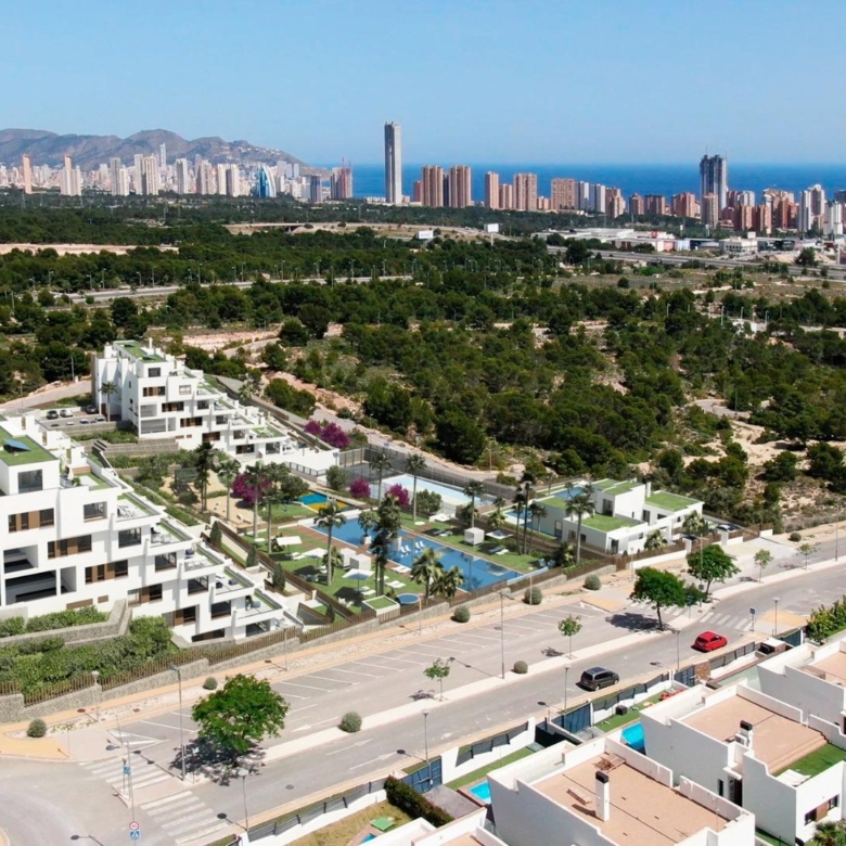 Complexe de luxe fermé avec des zones communes, des vues sur la mer et l’horizon de Benidorm, situé à quelques kilomètres de la vie animée de la plage, du centre commercial et des plages de sable.