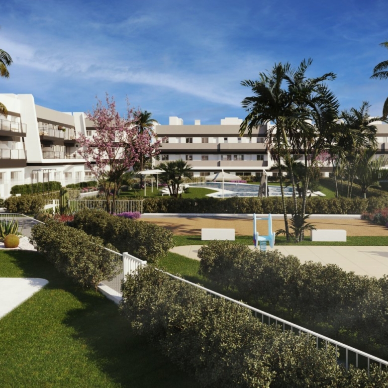 Ces nouveaux appartements sont construits selon des normes très élevées et forment une belle résidence avec des piscines, un parking souterrain privé, un cellier, des zones de jardin et une aire de jeux pour les enfants.