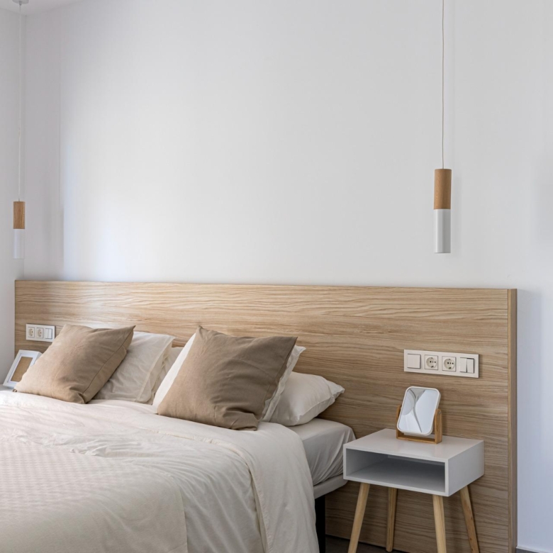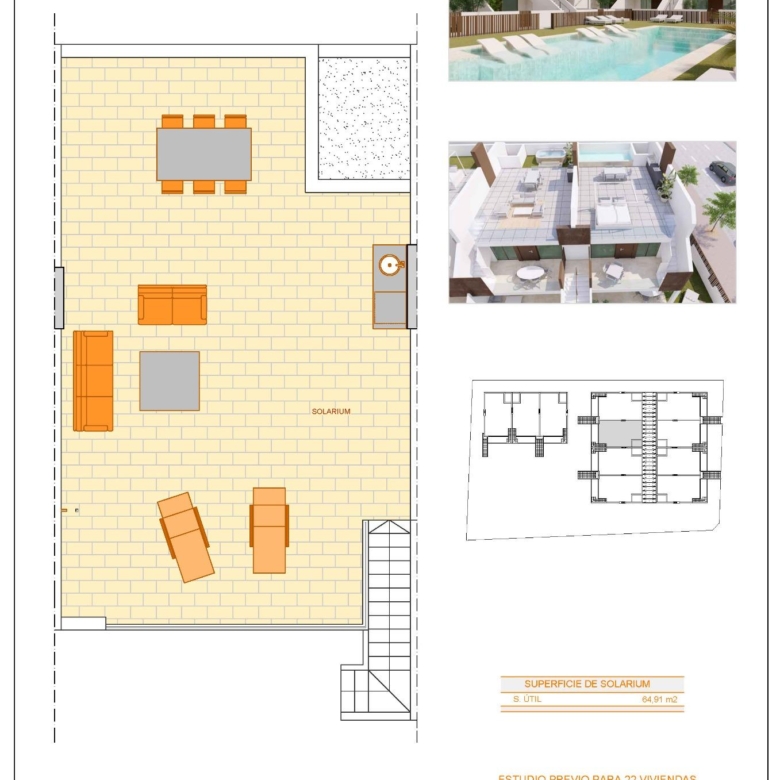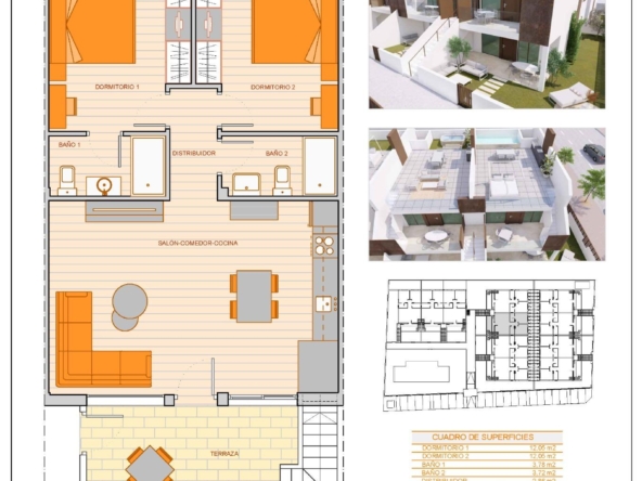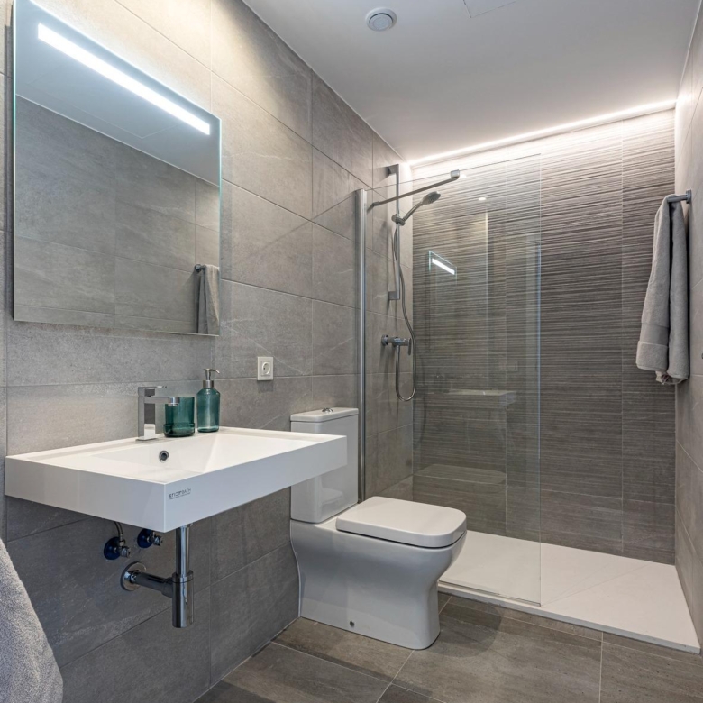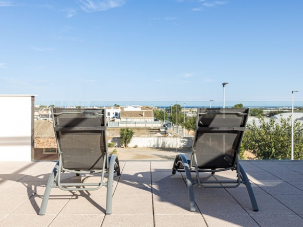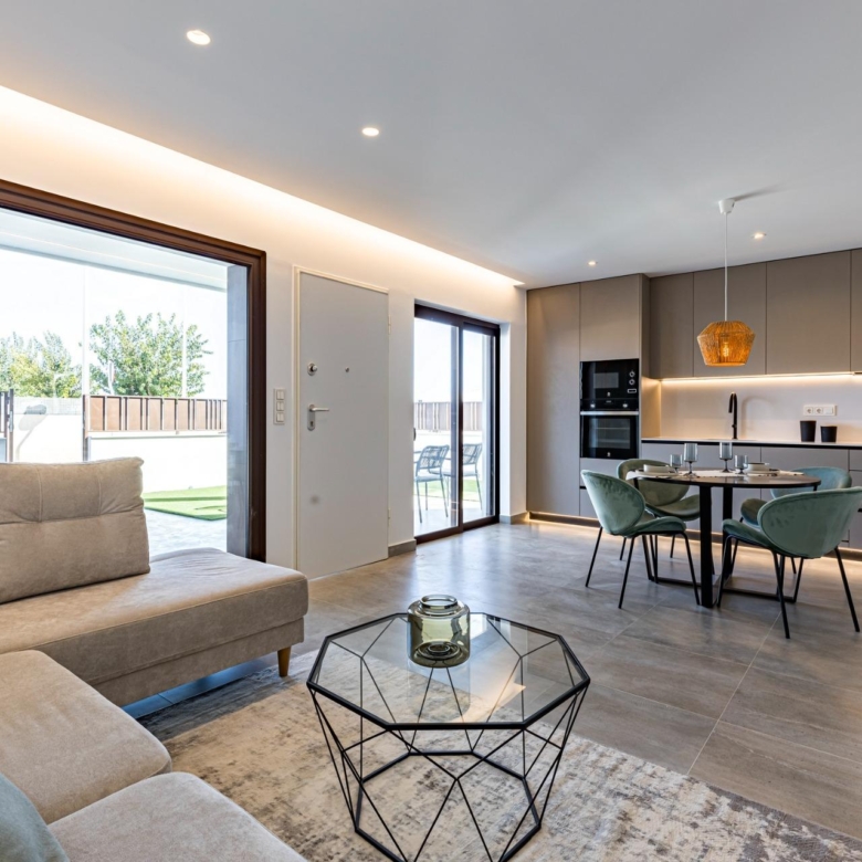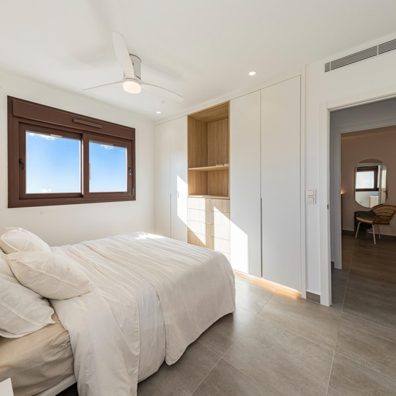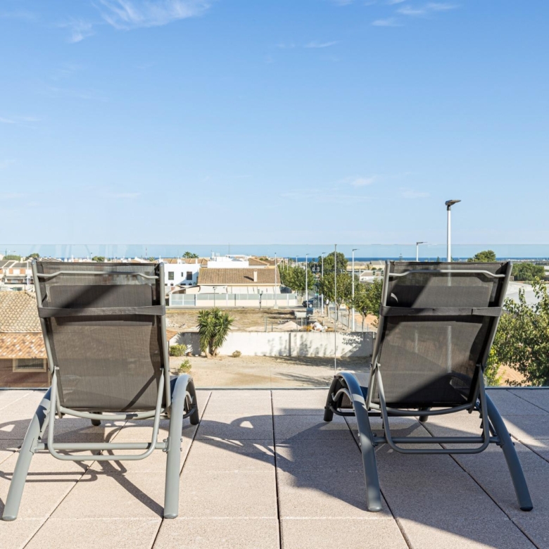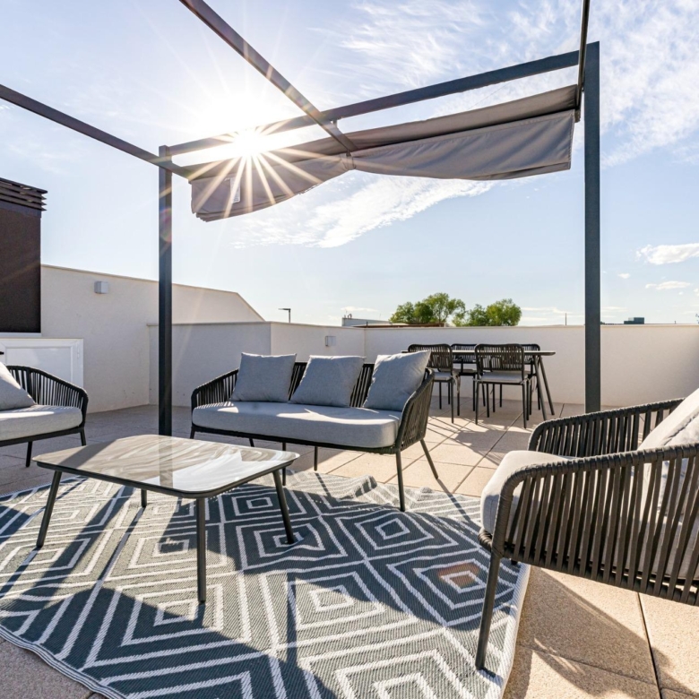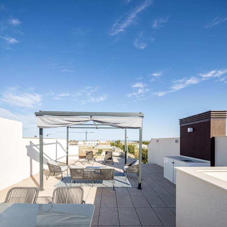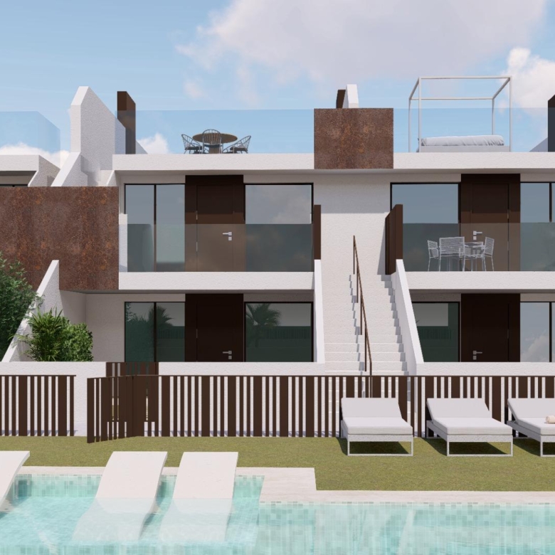 Les maisons du rez-de-chaussée disposent d’un grand jardin en gazon artificiel et au dernier étage, vous pourrez profiter du soleil toute l’année sur la terrasse et le solarium, ainsi que de la zone commune avec piscine et d’une place de parking pratique.