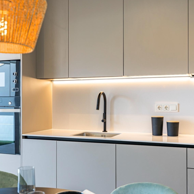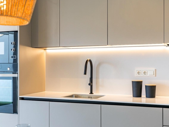Des bungalows modernes de 2 chambres, 2 salles de bains, cuisine ouverte sur le salon, armoires encastrées.