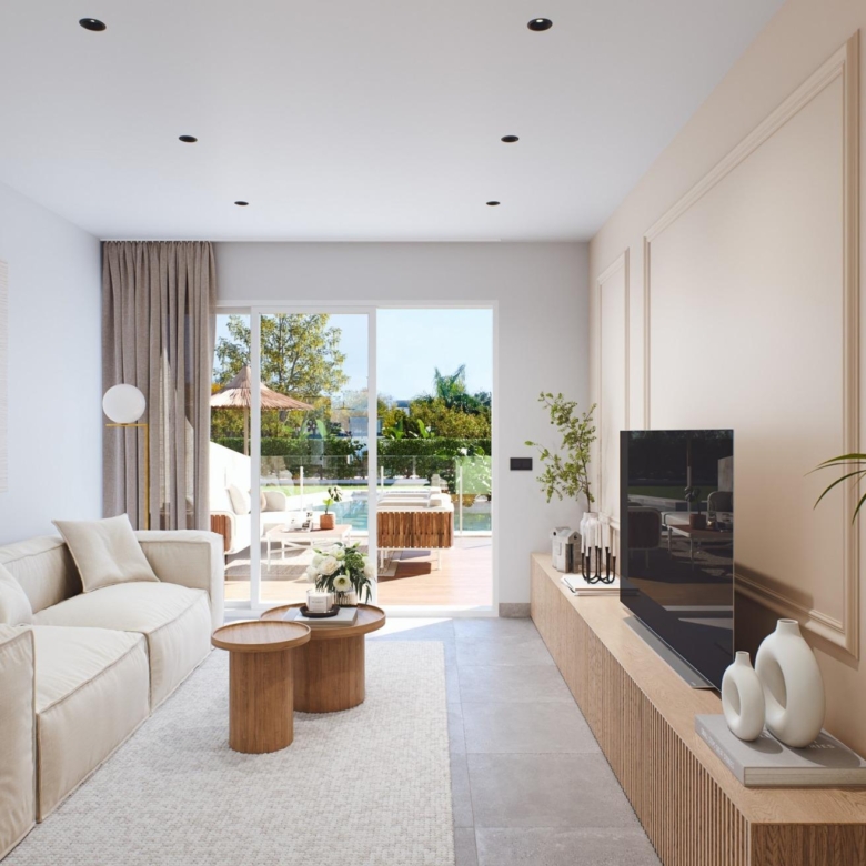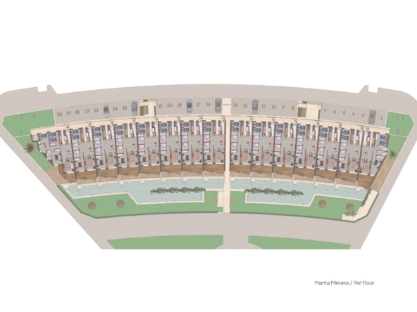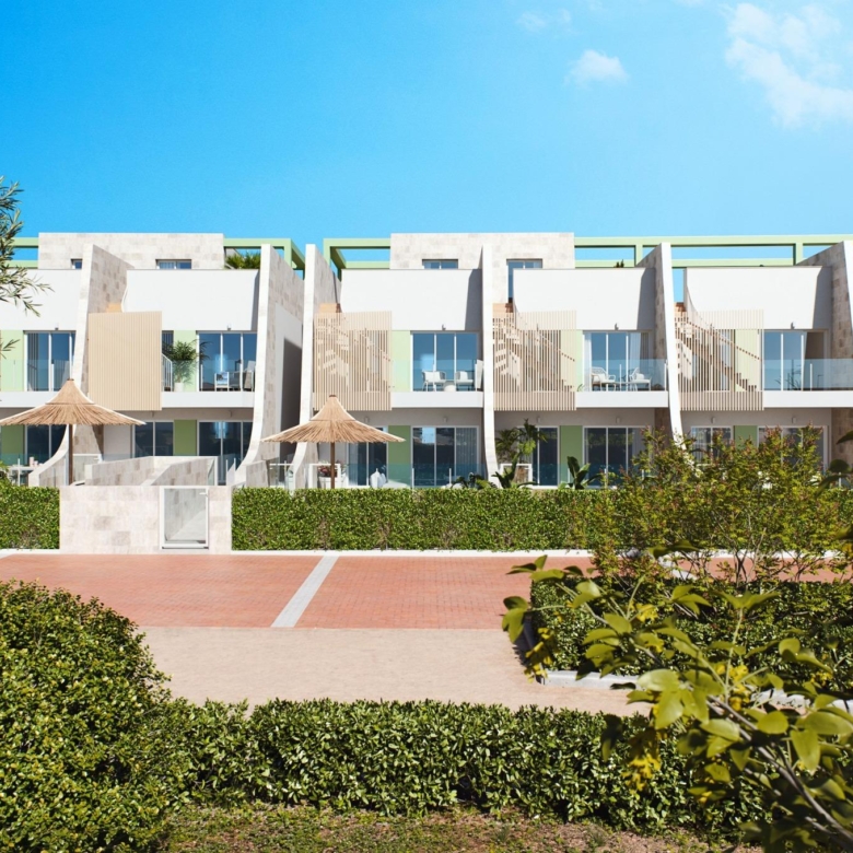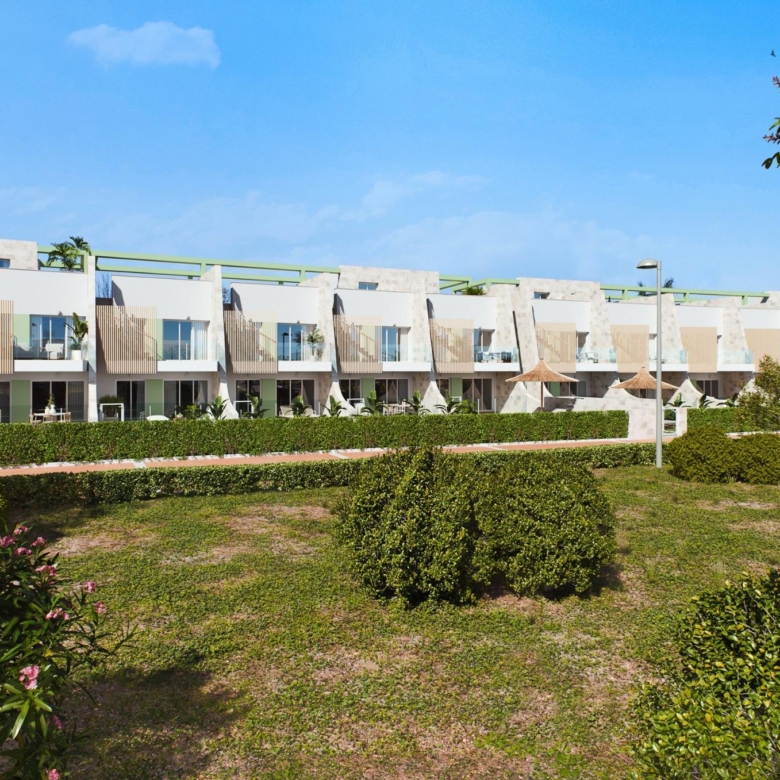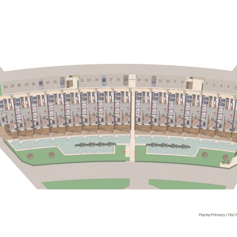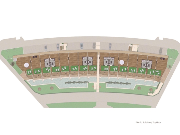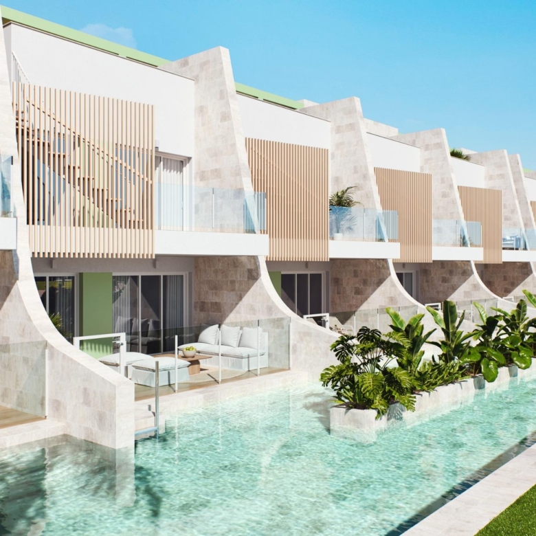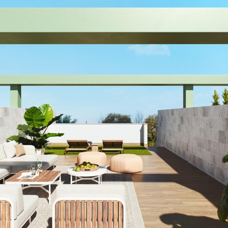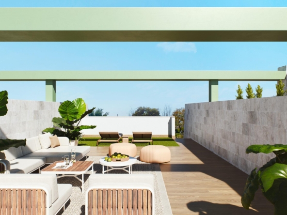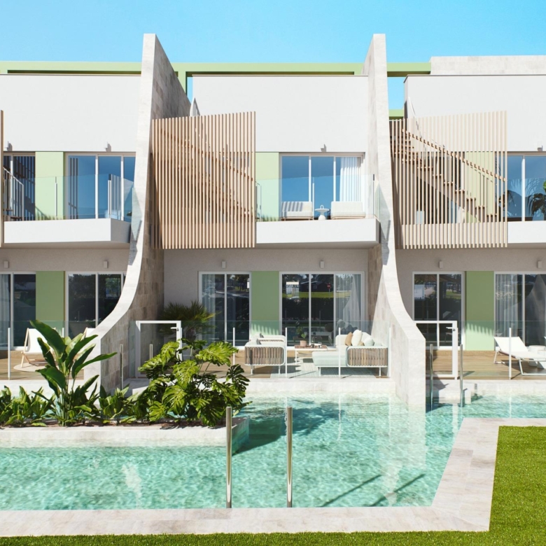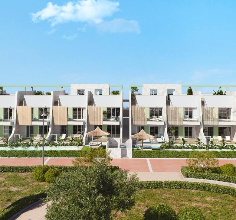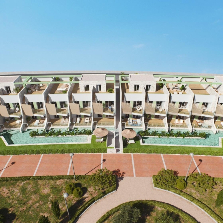 Nouvelle construction résidentielle de 30 bungalows, au dernier étage avec solarium privé et au rez-de-chaussée avec une belle terrasse et un accès direct à la piscine.