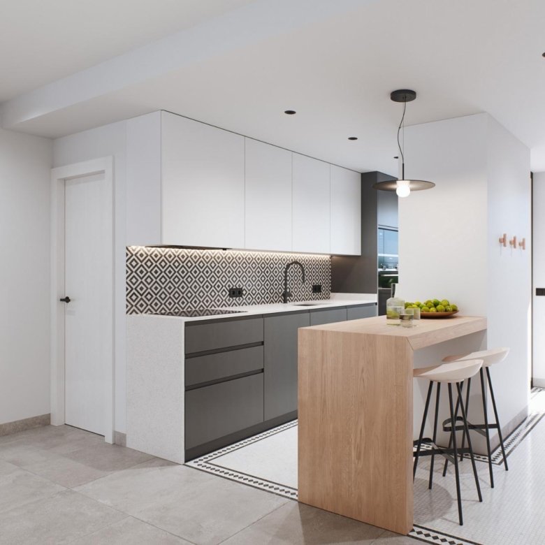 Bungalows modernes avec 2 et 3 chambres à coucher, 2 et 3 salles de bains, cuisine ouverte sur le salon, armoires encastrées.
