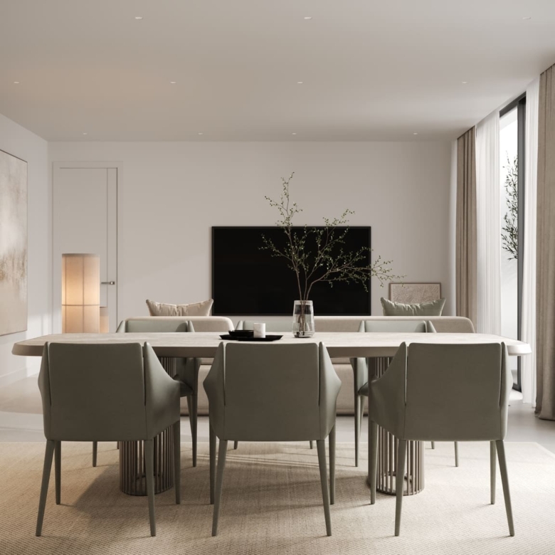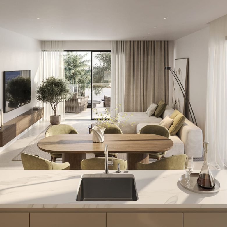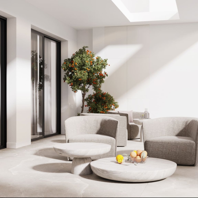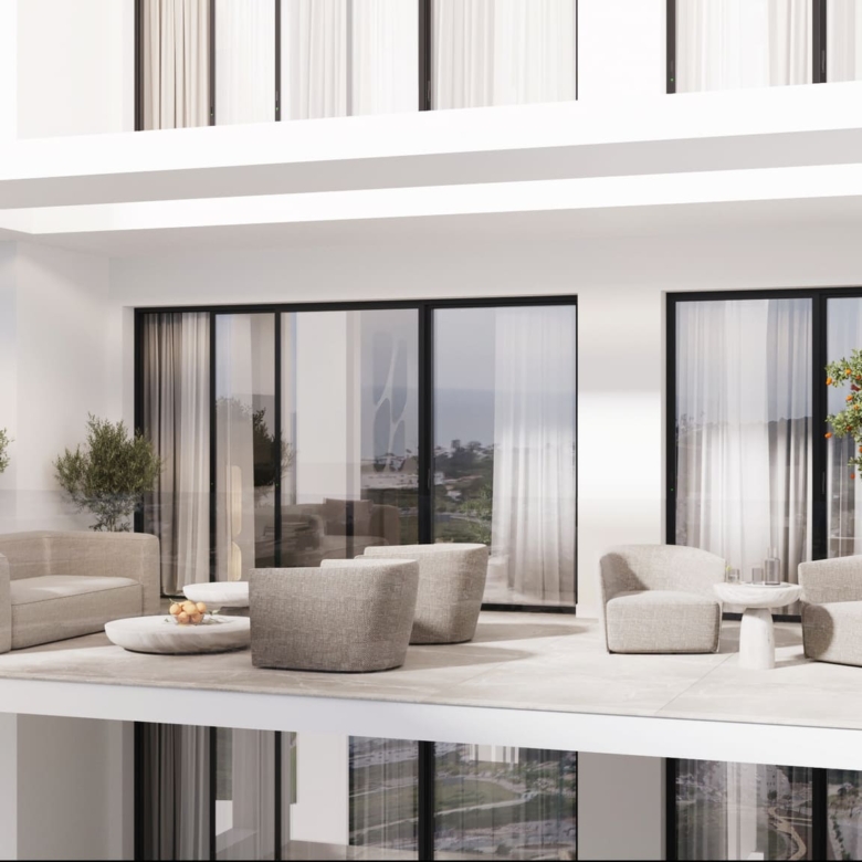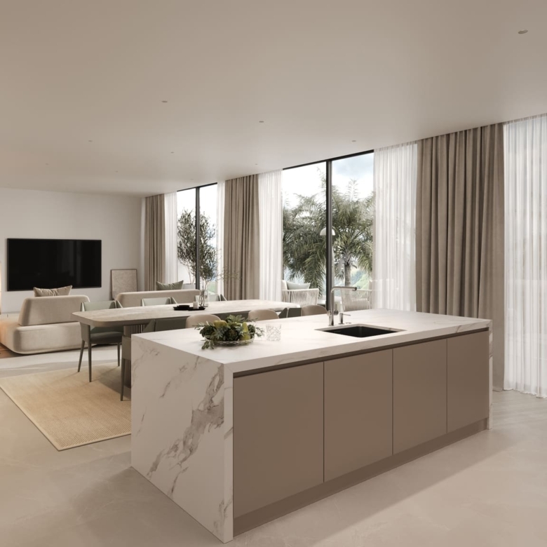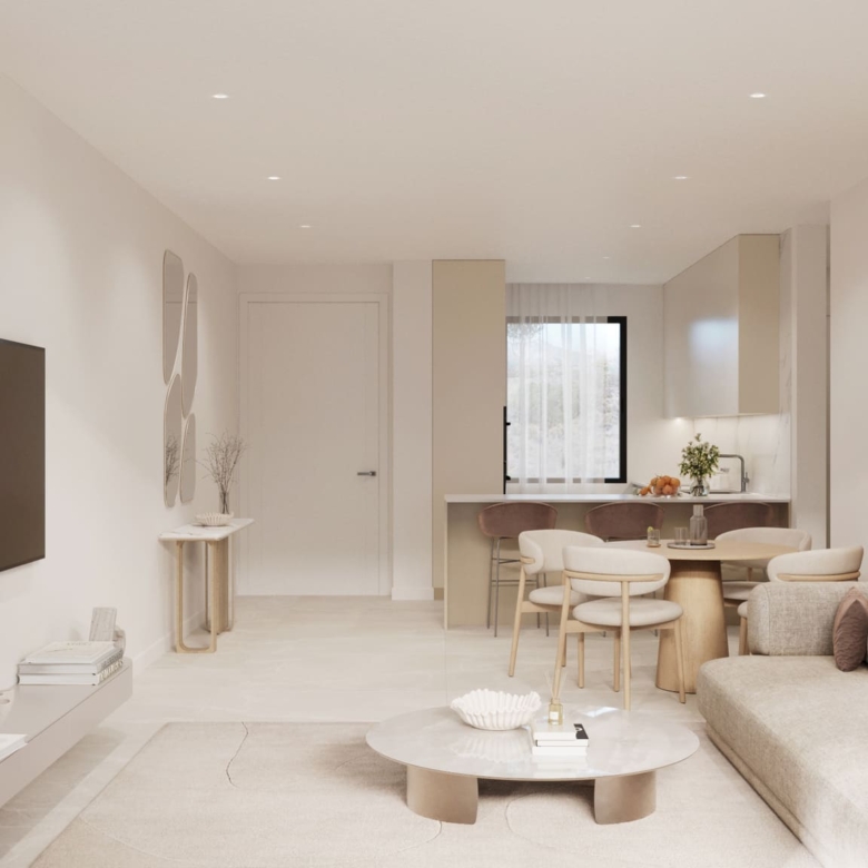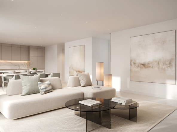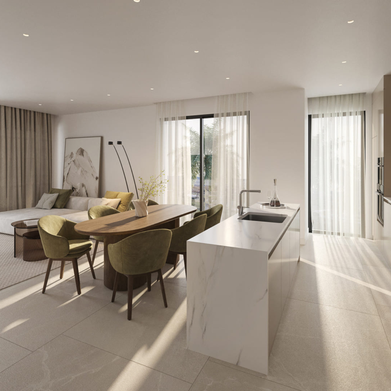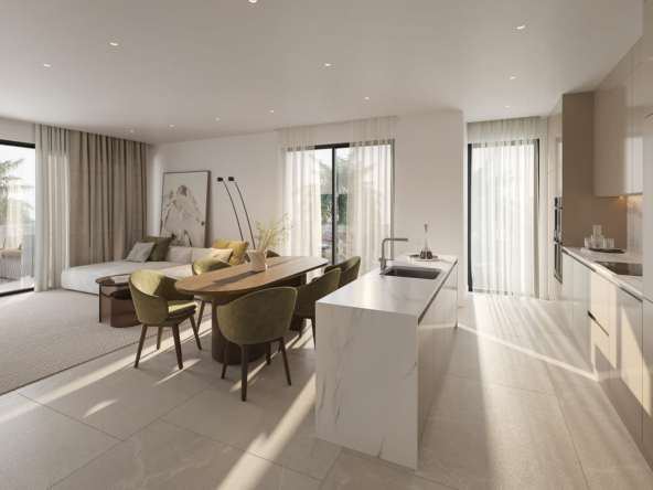 L’intérieur de ces résidences est conçu avec un accent sur le confort et la modernité. Les appartements et rez-de-chaussée offrent des options de 2 ou 3 chambres et 2 salles de bains, s’adaptant à différents besoins familiaux. Le chauffage par le sol assure une ambiance chaleureuse et accueillante pendant les mois les plus froids. Les sols en grès cérame apportent une touche d’élégance et sont faciles à entretenir. L’inclusion d’appareils modernes et d’un système domotique avancé facilite le quotidien, tandis que les placards intégrés offrent un espace de rangement efficace.