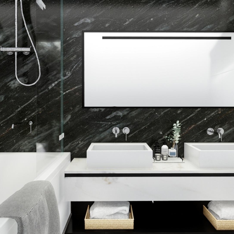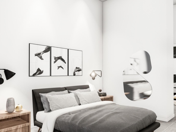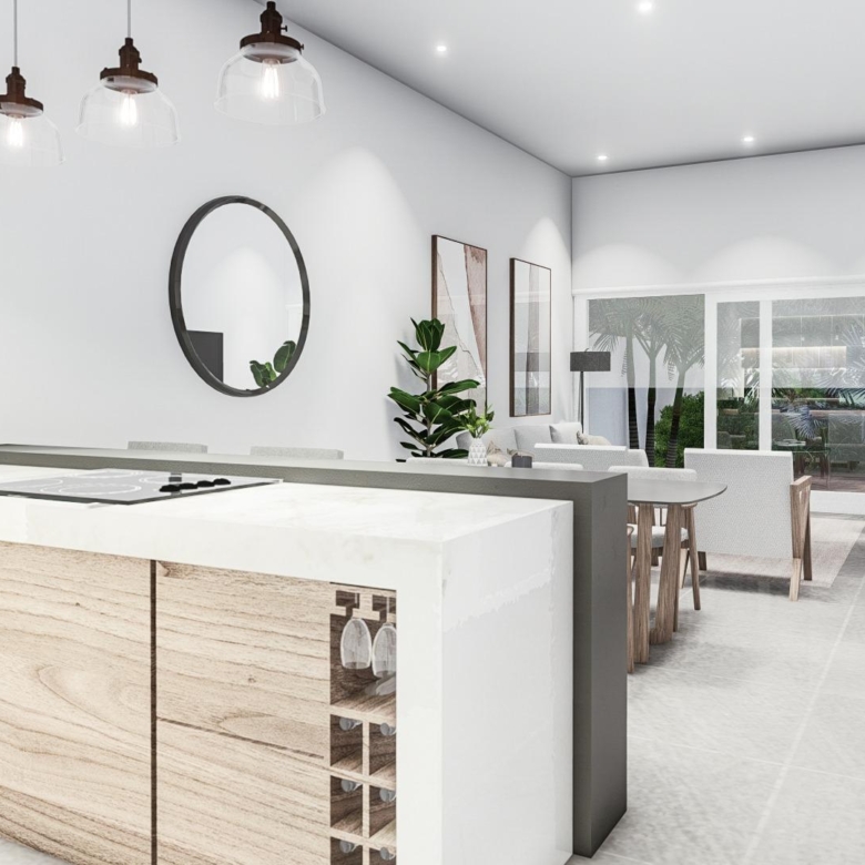 Propriétés modernes construites sur un étage, avec 3 chambres, 2 salles de bains, cuisine ouverte sur le salon, jardin avec piscine et place de parking.