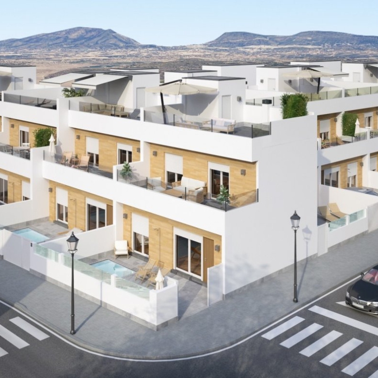 Les maisons de ville ont différentes zones terrasses et un grand solarium, vous permettant de profiter de toutes les heures de soleil tous les jours de l’année, avec piscine privée et parking sur le terrain .