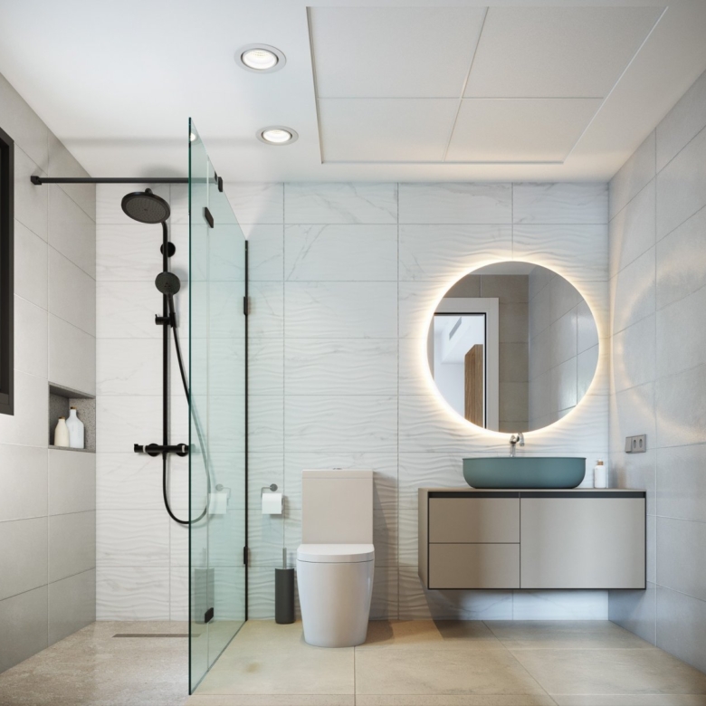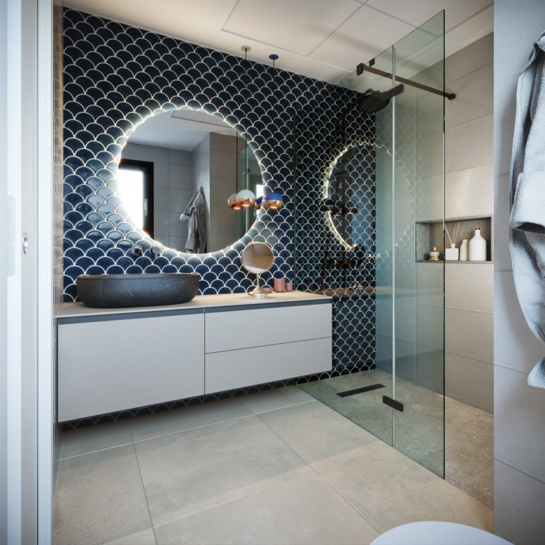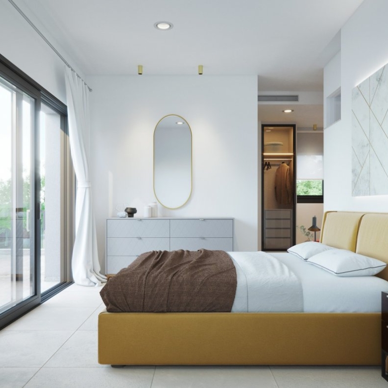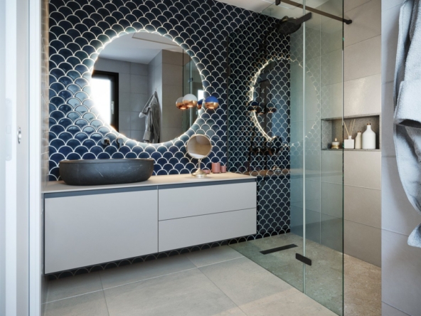 Au rez-de-chaussée, vous trouverez une chambre à coucher et une salle de bains commune, une cuisine ouverte et un salon avec de grandes portes-fenêtres menant à votre terrasse où vous pourrez profiter d’une piscine privée.