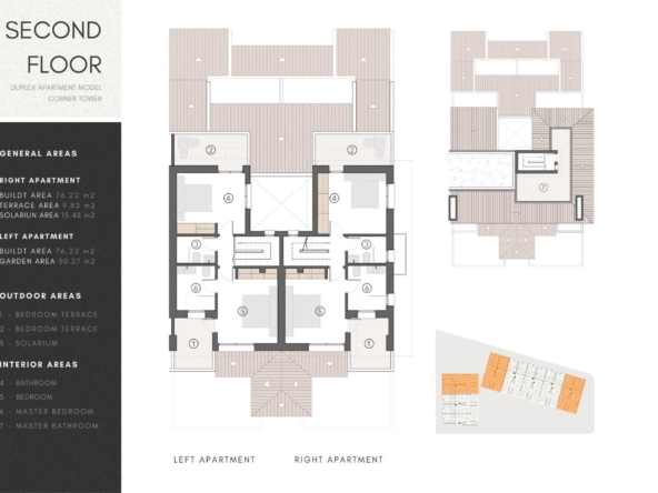 Les appartements du rez-de-chaussée ont 2 chambres à coucher, 2 salles de bains avec jardins privés et les penthouses ont 3 chambres à coucher, 3 salles de bains et terrasse, tous avec cuisine ouverte avec coin salon, armoires équipées, air conditionné, appareils électroménagers, place de parking et salle de stockage.
