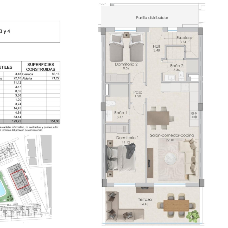 La résidence dispose d’appartements de 3 et 2 chambres, les deux types comprennent 2 salles de bains complètes, une cuisine ouverte sur le salon, des armoires encastrées, une terrasse et une place de parking.