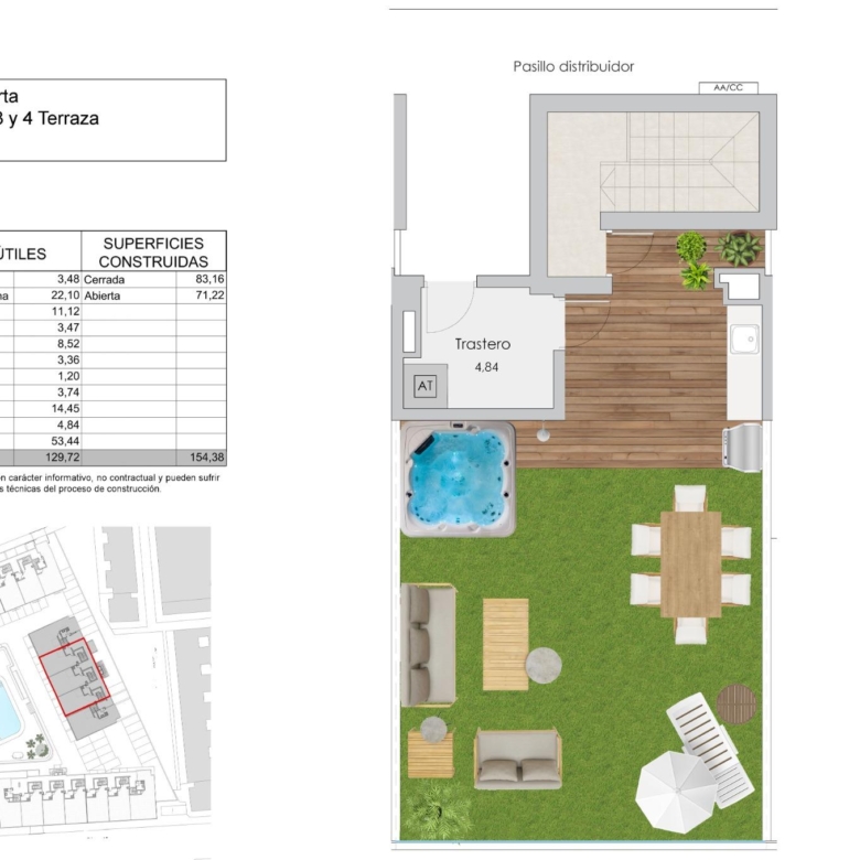 Ils disposent d’un jardin commun, d’une piscine avec entrée de type plage, équipée de douches et d’une grande pergola en bois. Le jardin est aménagé avec des palmiers et de la végétation, le tout éclairé. Dans la partie centrale de la piscine, il y a une zone moins profonde où se trouvent les lits d’eau.