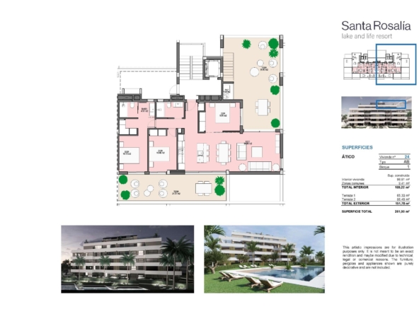 Magnifiques propriétés avec 1, 2 et 3 chambres à coucher et 1 ou 2 salles de bains, cuisine ouverte avec salon spacieux, armoires équipées, terrasses donnant sur les espaces verts de ce grand complexe de luxe.
