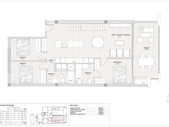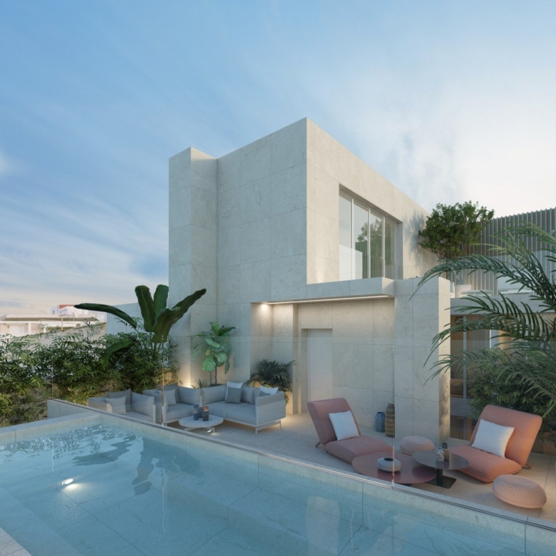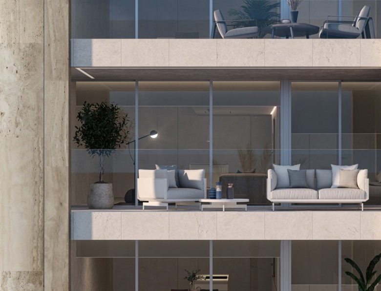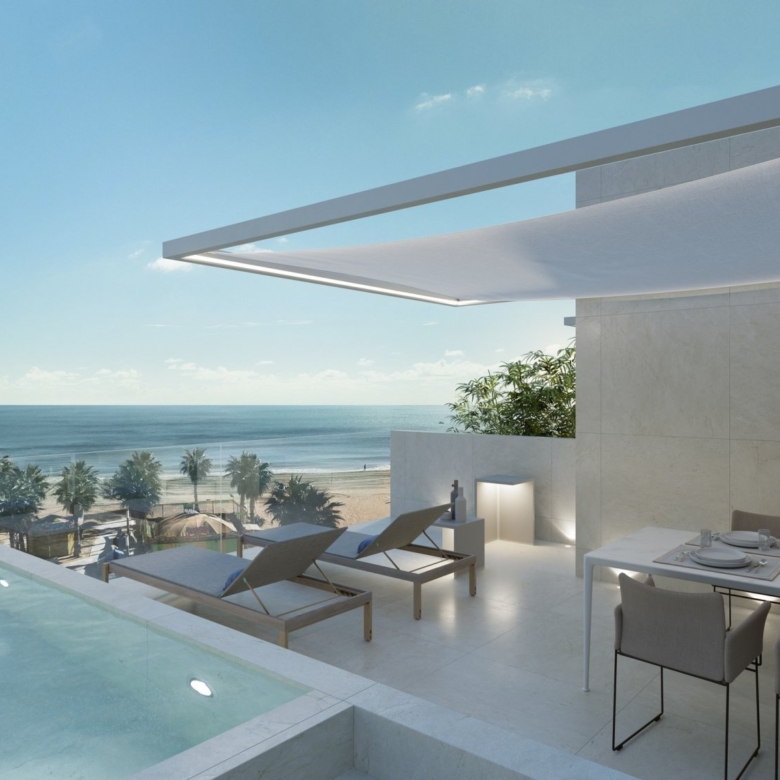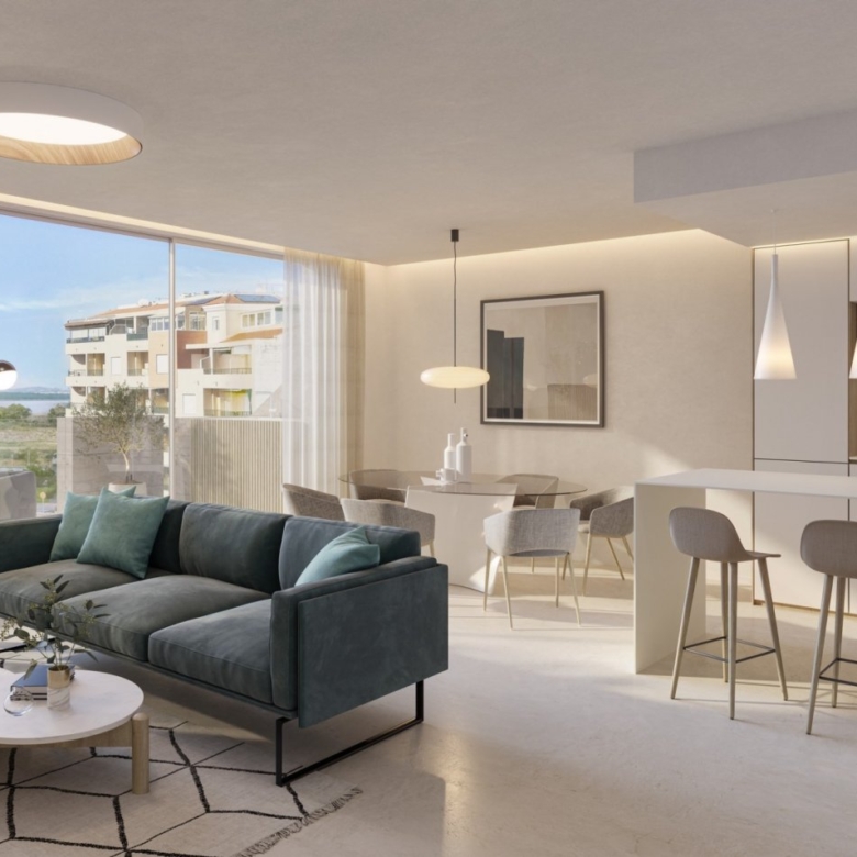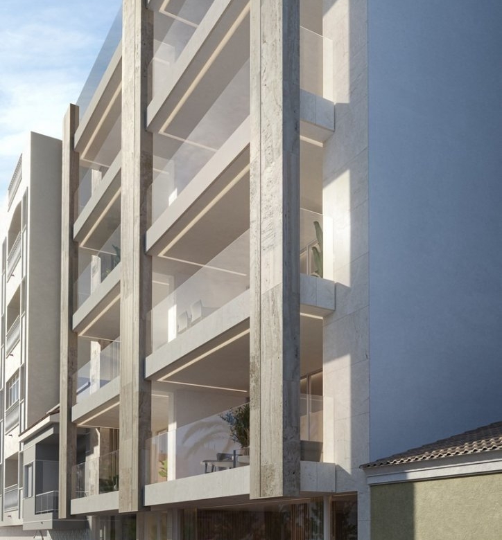 Les appartements sont composés de 3 chambres à coucher et de 2 salles de bains, d’une cuisine ouverte sur le salon, d’armoires encastrées et offrent une vue directe sur la place de la ville, la plage et la mer.