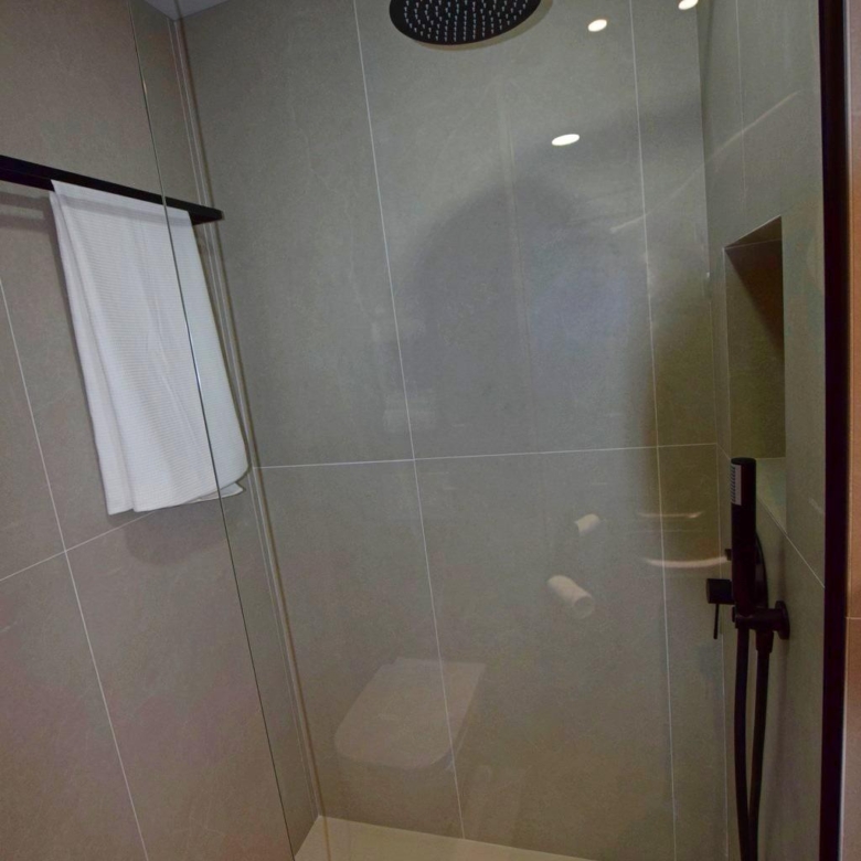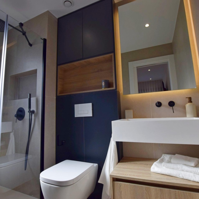 Salles de bains entièrement équipées avec meuble-lavabo, toilettes suspendues, miroir, douche murale, écrans de douche et chauffage radiant au sol.