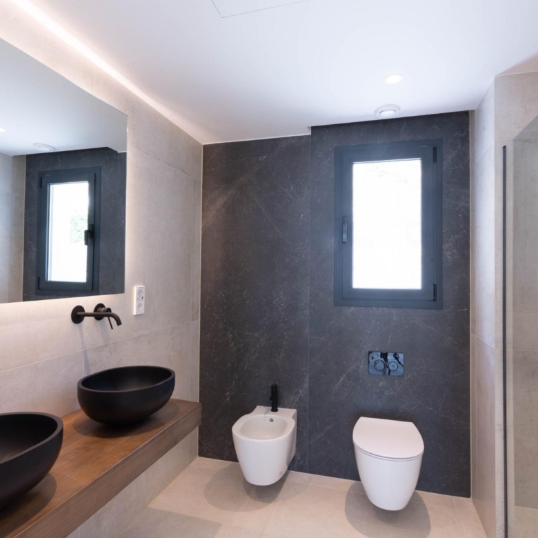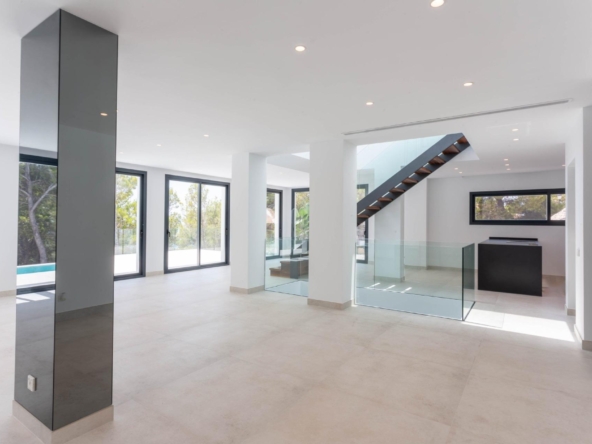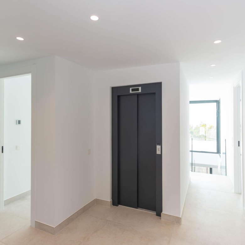 La villa a 4 niveaux. En entrant dans la maison, on accède au garage, d’où l’on descend au premier niveau avec 3 chambres, toutes équipées de salles de bains individuelles. En dessous, il y a la cuisine, la salle à manger et le salon avec un accès à une vaste terrasse avec une piscine « Infinity ». Au rez-de-chaussée se trouve une grande salle qui peut servir à la fois de salle de sport ou de zone de repos avec sauna et billard, selon les souhaits du client.
